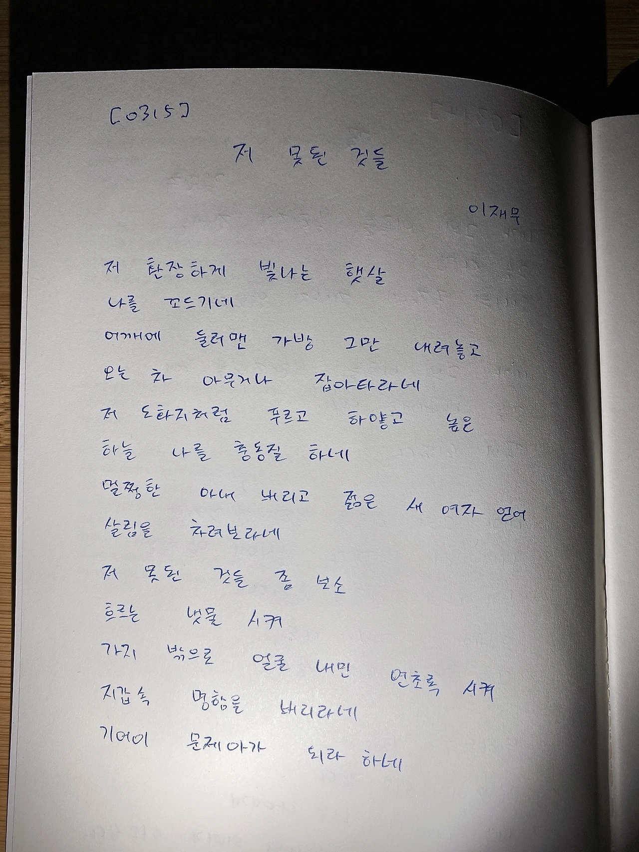 [0315] 저 못된 것들 - 이재무 저 환장하게 빛나는 햇살나를 꼬드기네어깨에 둘러맨 가방 그만 내려놓고오는 차 아무거나 잡아타라네저 도화지처럼 푸르고 하얗고 높은하늘 나를 충동질하네멀쩡한 아내 버리고 젊은 새 여자 얻어살림을 차려보라네저 못된 것들 좀 보소흐르는 냇물 시켜가지 밖으로 얼굴 내민 연초록 시켜지갑 속 명함을 버리라네기어이 문제아가 되라 하네