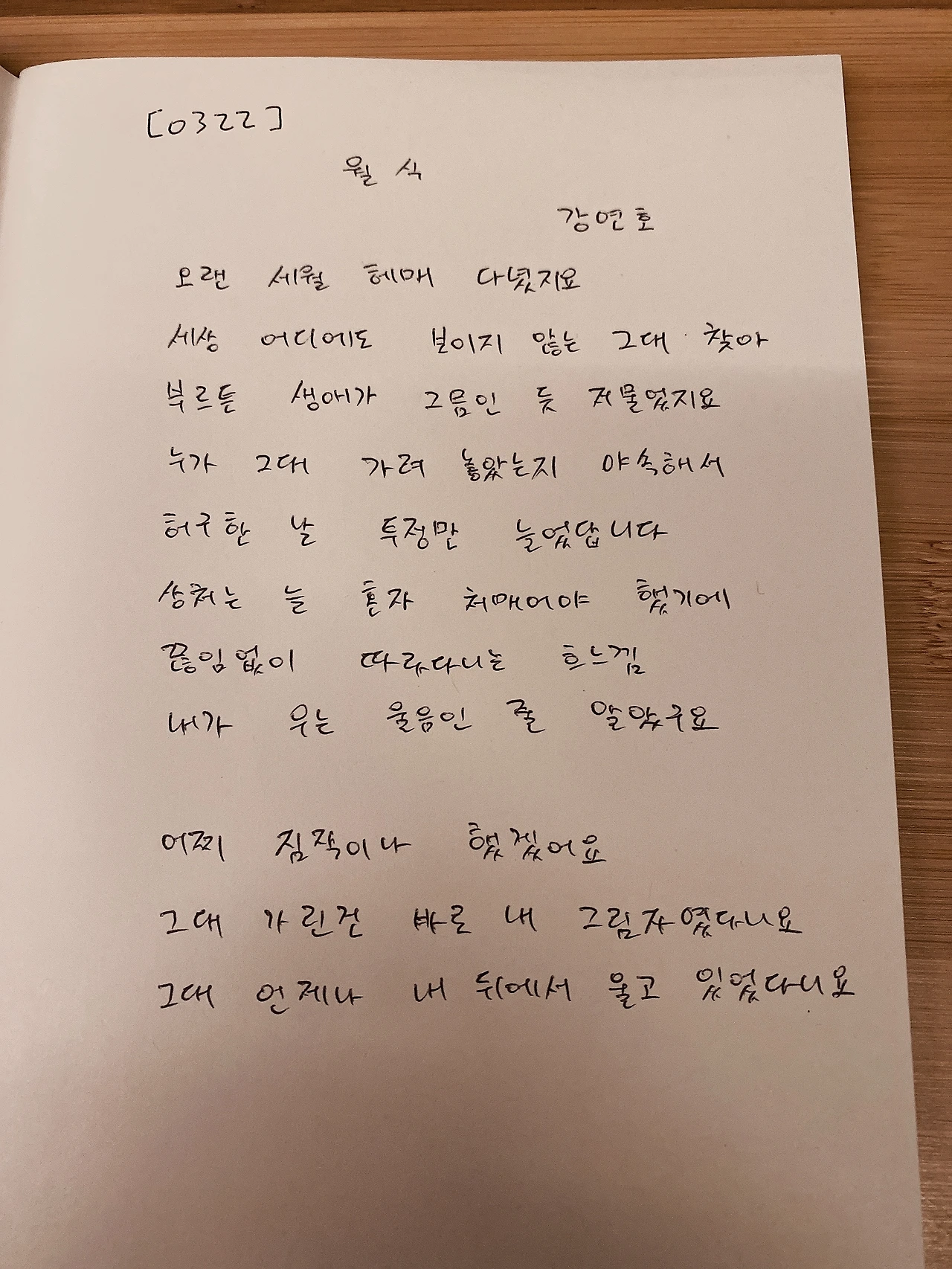 [0322] 월식 / 강연호 오랜 세월 헤매 다녔지요 세상 어디에도 보이지 않는 그대 찾아 부르튼 생애가 그믐인 듯 저물었지요 누가 그대 가려 놓았는지 야속해서 허구한 날 투정만 늘었답니다 상처는 늘 혼자 처매어야 했기에 끊임없이 따라다니는 흐느낌 내가 우는 울음인 줄 알았구요 어찌 짐작이나 했겠어요 그대 가린 건 바로 내 그림자였다니요 그대 언제나 내 뒤에서 울고 있었다니요