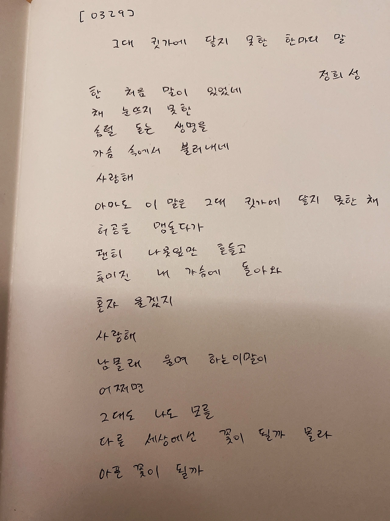 [0329] 그대 귓가에 닿지 못한 한마디 말 by 정희성한 처음 말이 있었네채 눈뜨지 못한솜털 돋는 생명을가슴 속에서 불러내네사랑해아마도 이 말은 그대 귓가에 닿지 못한 채허공을 맴돌다가괜히 나뭇잎만 흔들고후미진 내 가슴에 돌아와혼자 울겠지사랑해남몰래 울며 하는 이 말이어쩌면그대도 나도 모를다른 세상에선 꽃이 될까 몰라아픈 꽃이 될까