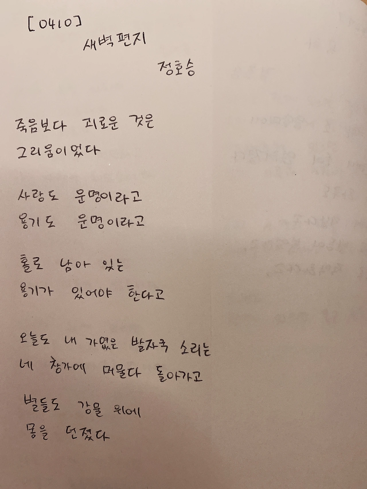 새벽편지 by 정호승 죽음보다 괴로운 것은그리움이었다 사랑도 운명이라고용기도 운명이라고 홀로 남아 있는용기가 있어야 한다고 오늘도 내 가엾은 발자국 소리는네 창가에 머물다 돌아가고 별들도 강물 위에몸을 던졌다