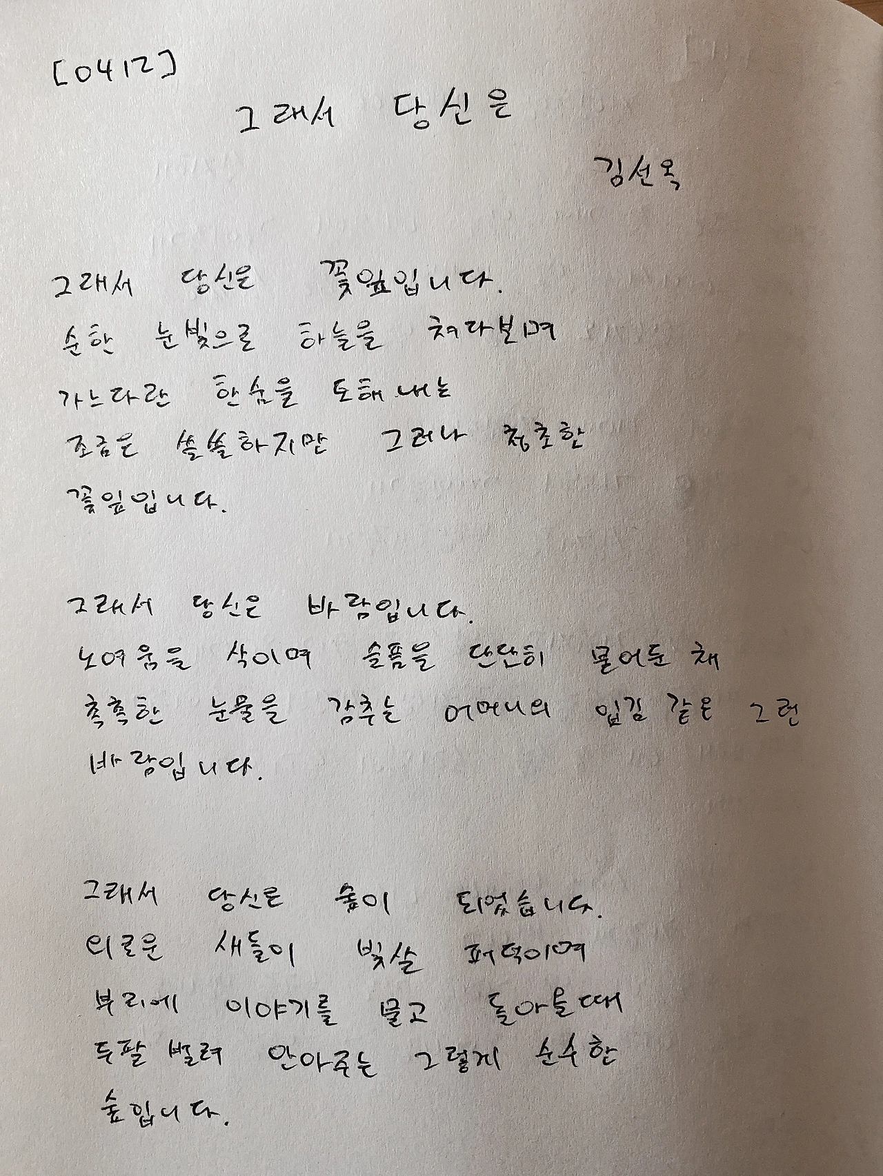 그래서 당신은 - 김선옥그래서 당신은 꽃잎입니다.순한 눈빛으로 하늘을 쳐다보며가느다란 한숨을 토해내는조금은 쓸쓸하지만 그러나 청초한꽃잎입니다. 그래서 당신은 바람입니다.노여움을 삭이며 슬픔을 단단히 묻어둔 채촉촉한 눈물을 감추는 어머니의 입김 같은 그런바람입니다. 그래서 당신은 숲이 되었습니다.외로운 새들이 빛살 퍼덕이며부리에 이야기를 물고 돌아올 때두팔 벌려 안아주는 그렇게 순수한숲입니다.