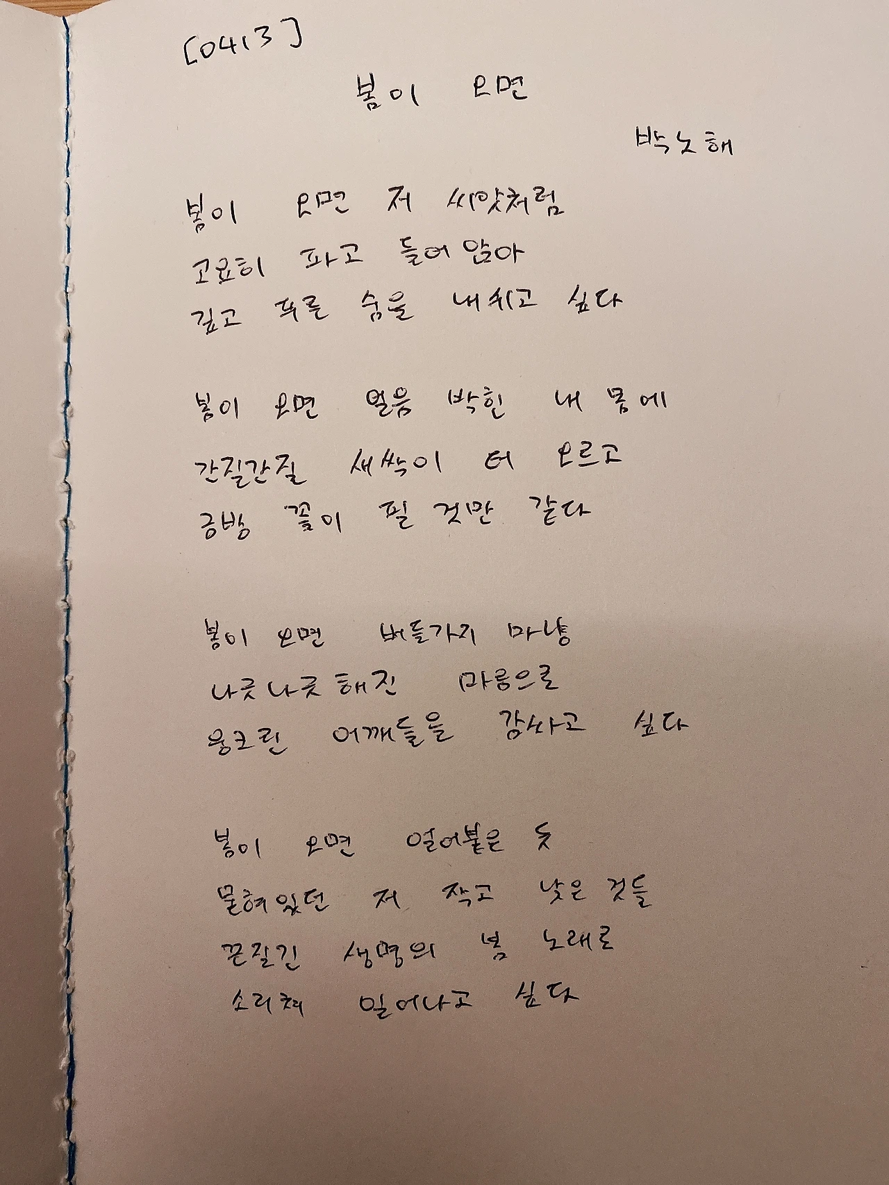 봄이 오면 -박노해- 봄이 오면 저 씨앗처럼고요히 파고 들어앉아깊고 푸른 숨을 내쉬고 싶다 봄이 오면 얼음 박힌 내 몸에간질간질 새싹이 터 오르고금방 꽃이 필 것만 같다 봄이 오면 버들가지 마냥나긋나긋해진 마음으로웅크린 어깨들을 감싸고 싶다 봄이 오면 얼어붙은 듯묻혀있던 저 작고 낮은 것들끈질긴 생명의 봄 노래로소리쳐 일어나고 싶다