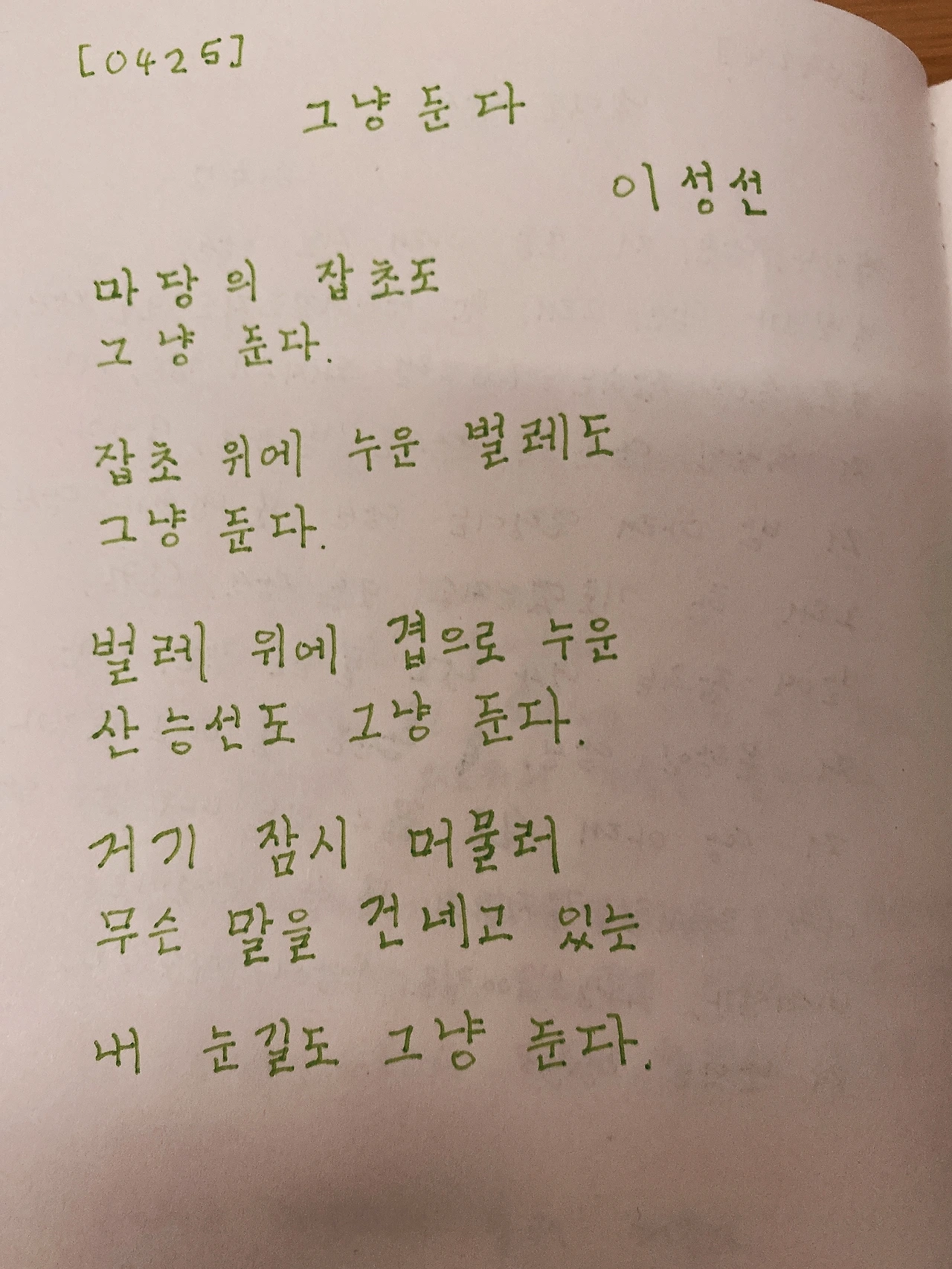 그냥 둔다 by 이성선 마당의 잡초도그냥 둔다. 잡초 위에 누운 벌레도그냥 둔다. 벌레 위에 겹으로 누운산 능선도 그냥 둔다. 거기 잠시 머물러무슨 말을 건네고 있는 내 눈길도 그냥 둔다.