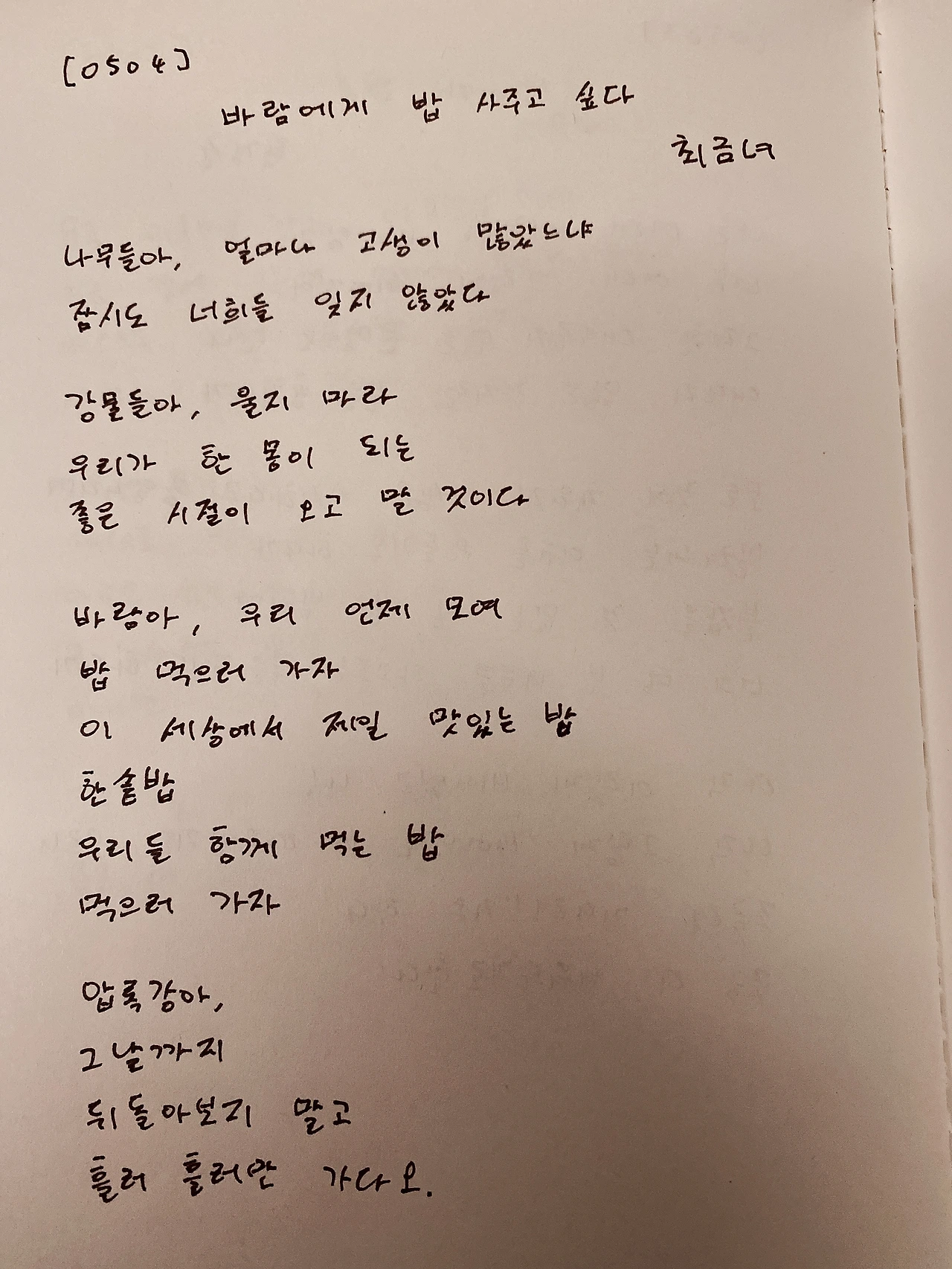 바람에게 밥 사주고 싶다 ― 최금녀 나무들아, 얼마나 고생이 많았느냐잠시도 너희들 잊지 않았다 강물들아, 울지 마라우리가 한 몸이 되는좋은 시절이 오고 말 것이다 바람아, 우리 언제 모여밥 먹으러 가자이 세상에서 제일 맛있는 밥한솥밥우리들 함께 먹는 밥먹으러 가자 압록강아,그날까지뒤돌아보지 말고흘러 흘러만 가다오.