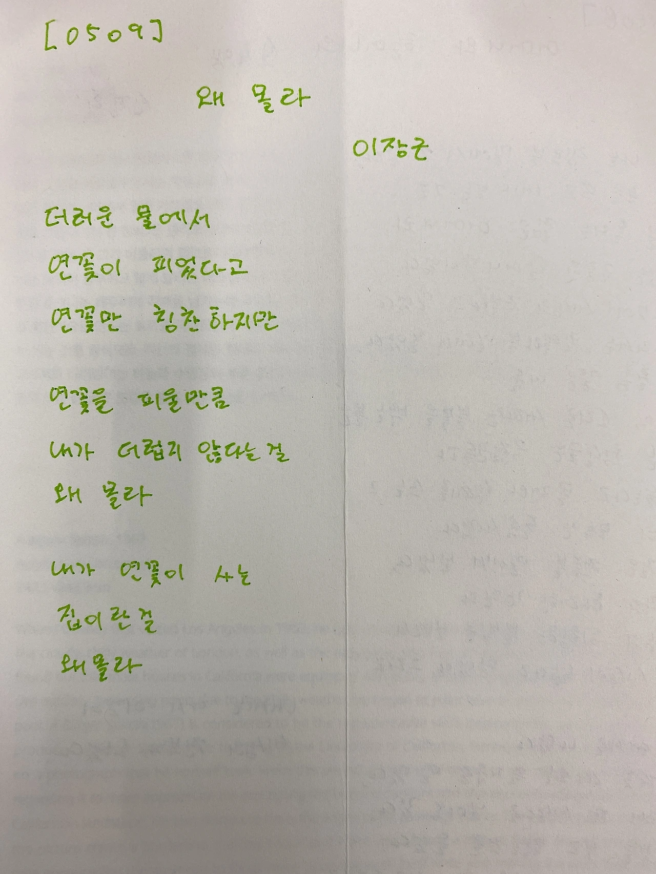왜몰라 by.이장근더러운 물에서연꽃이 피었다고연꽃만 칭찬하지만 연꽃을피울만큼 내가 더럽지 않다는 걸왜 몰라 내가 연꽃이 사는집이란걸왜몰라