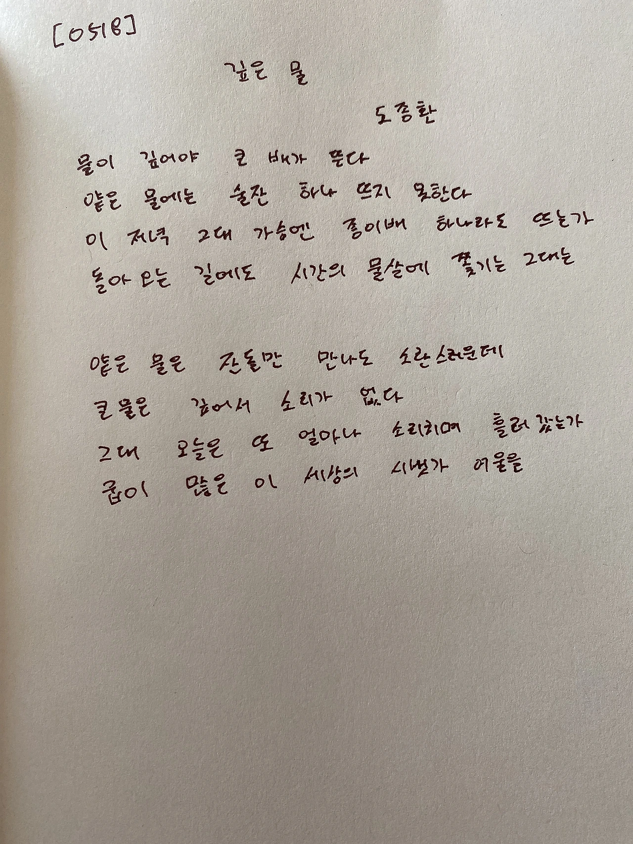 깊은 물 - 도종환물이 깊어야 큰 배가 뜬다얕은 물에는 술잔 하나 뜨지 못한다이 저녁 그대 가슴엔 종이배 하나라도 뜨는가돌아오는 길에도 시간의 물살에 쫓기는 그대는 얕은 물은 잔돌만 만나도 소란스러운데큰 물은 깊어서 소리가 없다그대 오늘은 또 얼마나 소리치며 흘러갔는가굽이 많은 이 세상의 시냇가 여울을