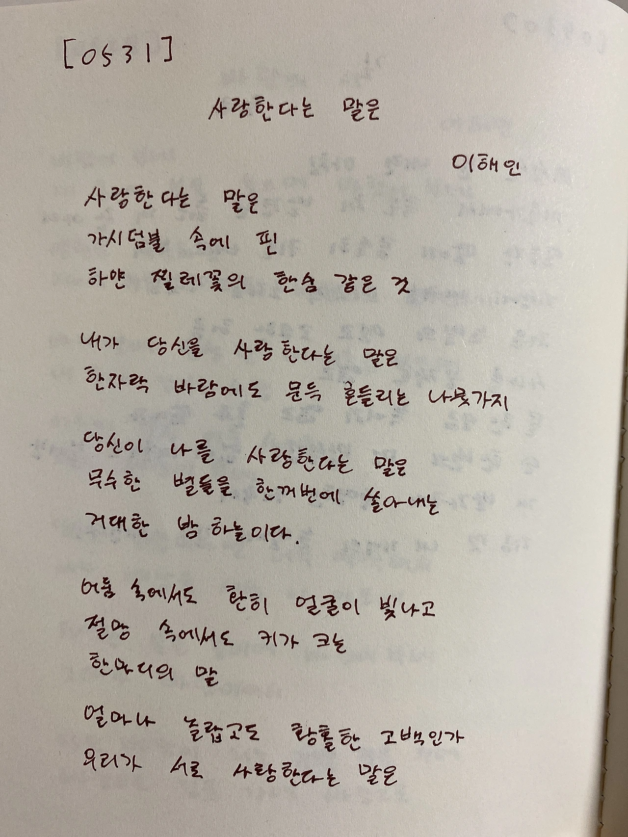 사랑한다는 말은_이해인 사랑한다는 말은가시덤불 속에 핀하얀 찔레꽃의 한숨 같은 것 내가 당신을 사랑한다는 말은한 자락 바람에도 문득 흔들리는 나뭇가지 당신이 나를 사랑한다는 말은무수한 별들을 한꺼번에 쏟아내는거대한 밤 하늘이다. 어둠 속에서도 환히 얼굴이 빛나고절망 속에서도 키가 크는한마디의 말 얼마나 놀랍고도 황홀한 고백인가우리가 서로 사랑한다는 말은