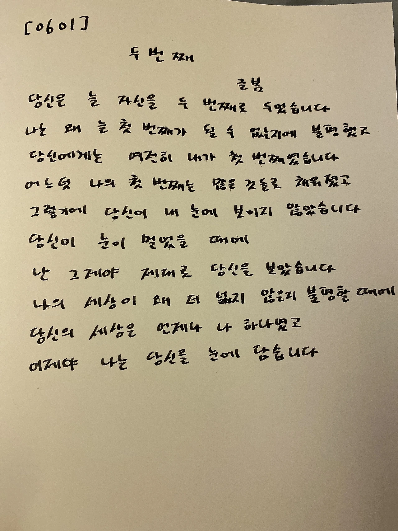 두번째 by. 글봄당신은 늘 자신을 두 번째로 두었습니다나는 왜 늘 첫 번째가 될 수 없는지에 불평했고당신에게는 여전히 내가 첫 번째였습니다어느덧 나의 첫 번째는 많은 것들로 채워졌고그렇기에 당신이 내 눈에 보이지 않았습니다당신이 눈이 멀었을 때에난 그제야 제대로 당신을 보았습니다나의 세상이 왜 더 넓디 않은지 불평할 때에당신의 세상은 언제나 나 하나였고이제야 나는 당신을 눈에 담습니다