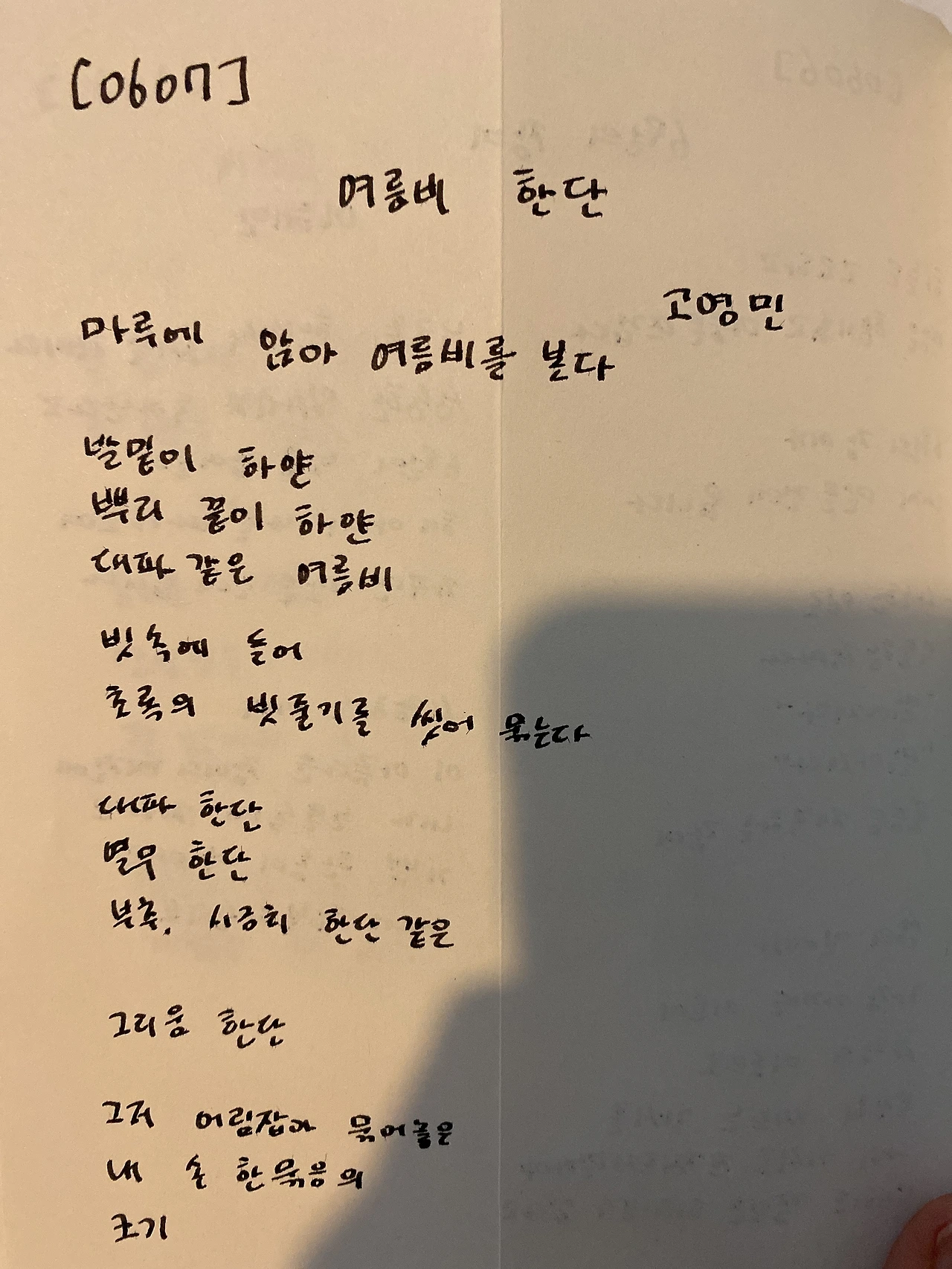 평범한 직장인. 사내 동호회를 통해 매일 한편 손으로 시 읽기를 시작한 이후로, 매일 시 한편을 필사 합니다. 필사한 시가 저작권에 문제가 된다면 말씀해주세요.