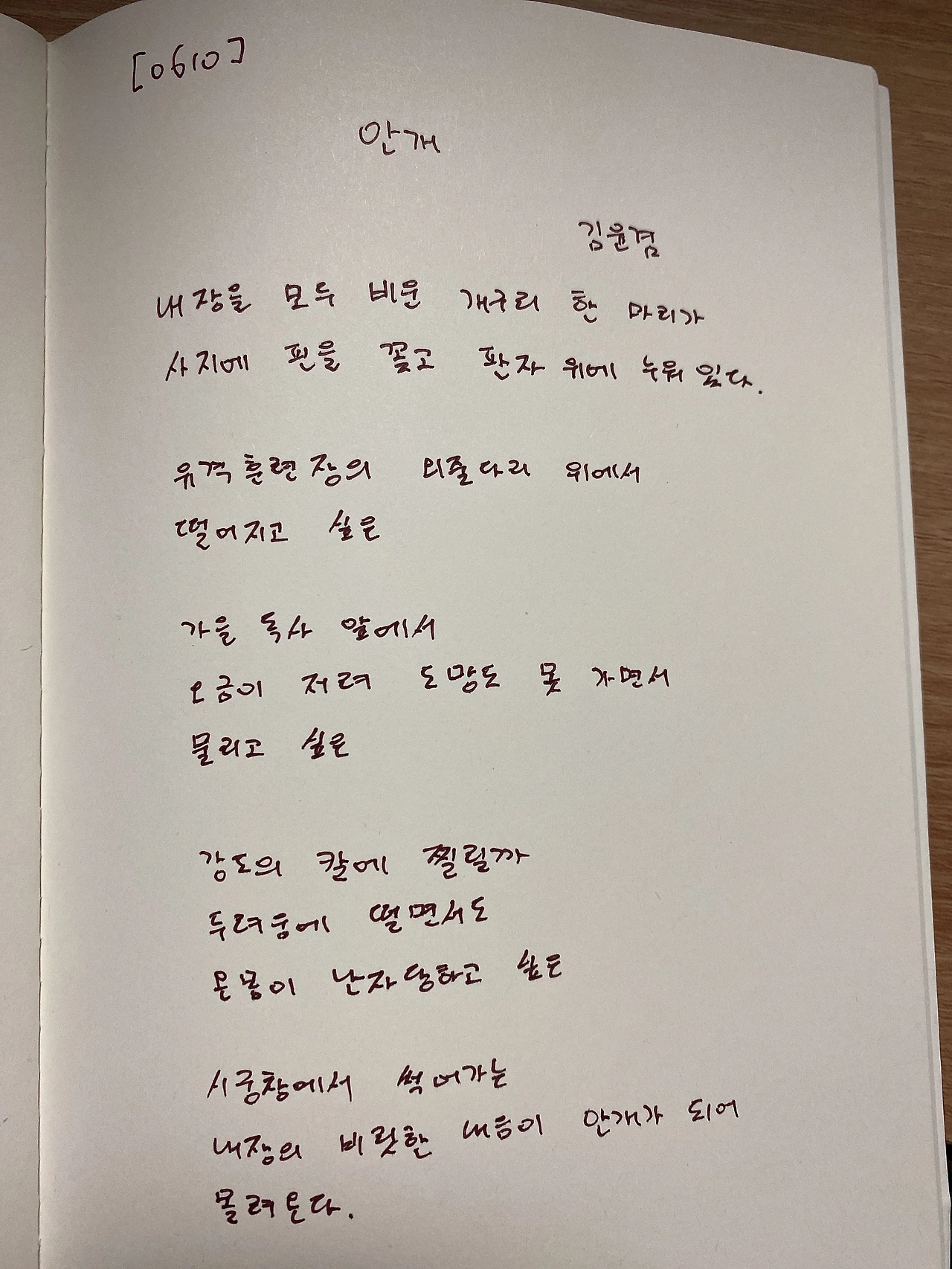 평범한 직장인. 사내 동호회를 통해 매일 한편 손으로 시 읽기를 시작한 이후로, 매일 시 한편을 필사 합니다. 필사한 시가 저작권에 문제가 된다면 말씀해주세요.