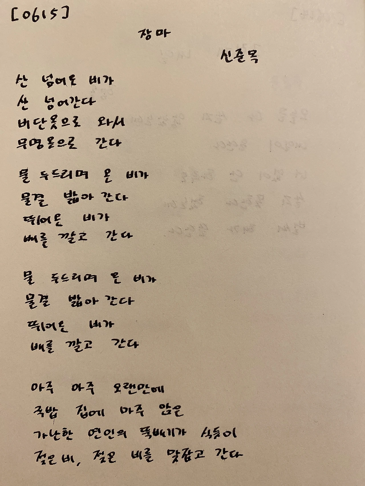 장마 신준목 산 넘어온 비가산 넘어간다비단옷으로 와서무명옷으로 간다 물 두드리며 온 비가물결 밟아 간다뛰어온 비가배를 깔고 간다 물 두드리며 온 비가물결 밟아 간다뛰어온 비가배를 깔고 간다 아주 아주 오랜만에국밥 집에 마주 앉은가난한 연인의 뚝배기가 식듯이젖은 비, 젖은 비를 맞잡고 간다