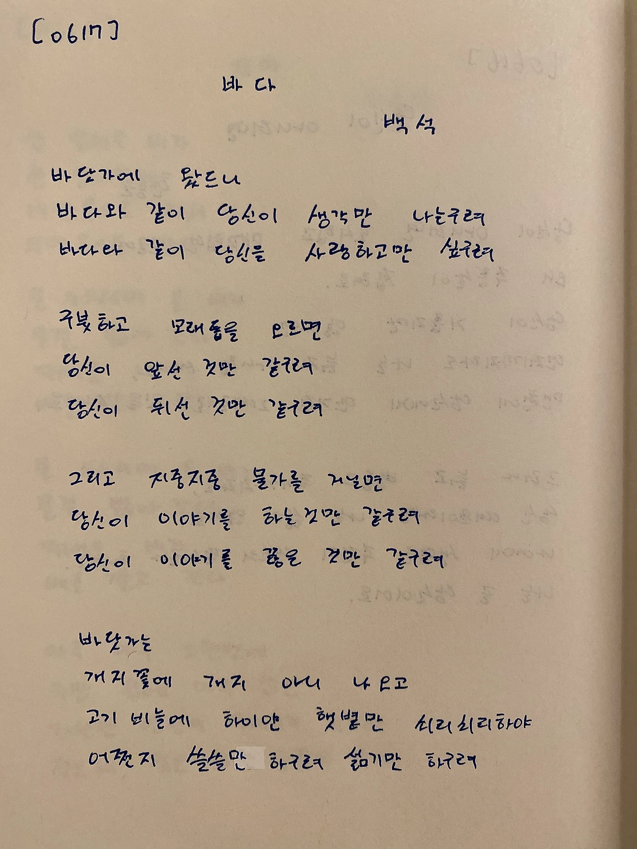 바다 백석바닷가에 왔드니바다와 같이 당신이 생각만 나는구려바다와 같이 당신을 사랑하고만 싶구려 구붓하고 모래톱을 오르면당신이 앞선 것만 같구려당신이 뒤선 갓만 같구려 그리고 지중지중 물가를 거닐면 당신이 이야기를 하는 것만 같구려당신이 이야기를 끊은 것만 같구려 바닷가는개지꽃에 개지 아니 나오고고기비늘에 하이얀 햇볕만 쇠리쇠리하야어쩐지 쓸쓸만 하구려 섧기만 하구려