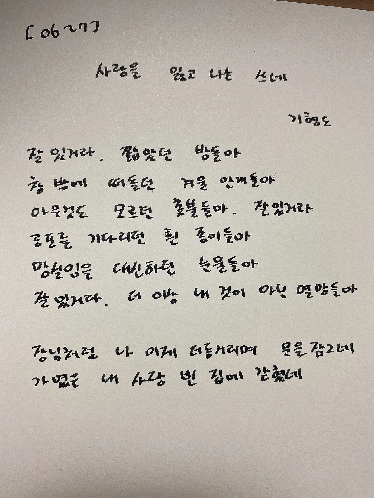 사랑을 잃고 나는 쓰네 by 기형도잘 있거라. 짧았던 밤들아창 밖을 떠돌던 겨울 안개들아아무 것도 모르던 촛불들아. 잘 있거라공포를 기다리던 흰 종이들아망설임을 대신하던 눈물들아잘 있거라. 더 이상 내 것이 아닌 열망들아장님처럼 나 이제 더듬거리며 문을 잠그네가엾은 내 사랑 빈 집에 갇혔네