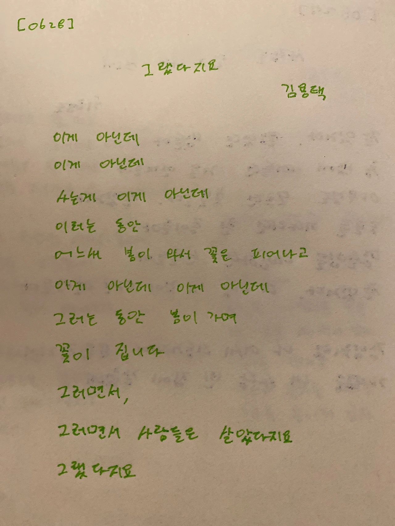 평범한 직장인. 사내 동호회를 통해 매일 한편 손으로 시 읽기를 시작한 이후로, 매일 시 한편을 필사 합니다. 필사한 시가 저작권에 문제가 된다면 말씀해주세요.