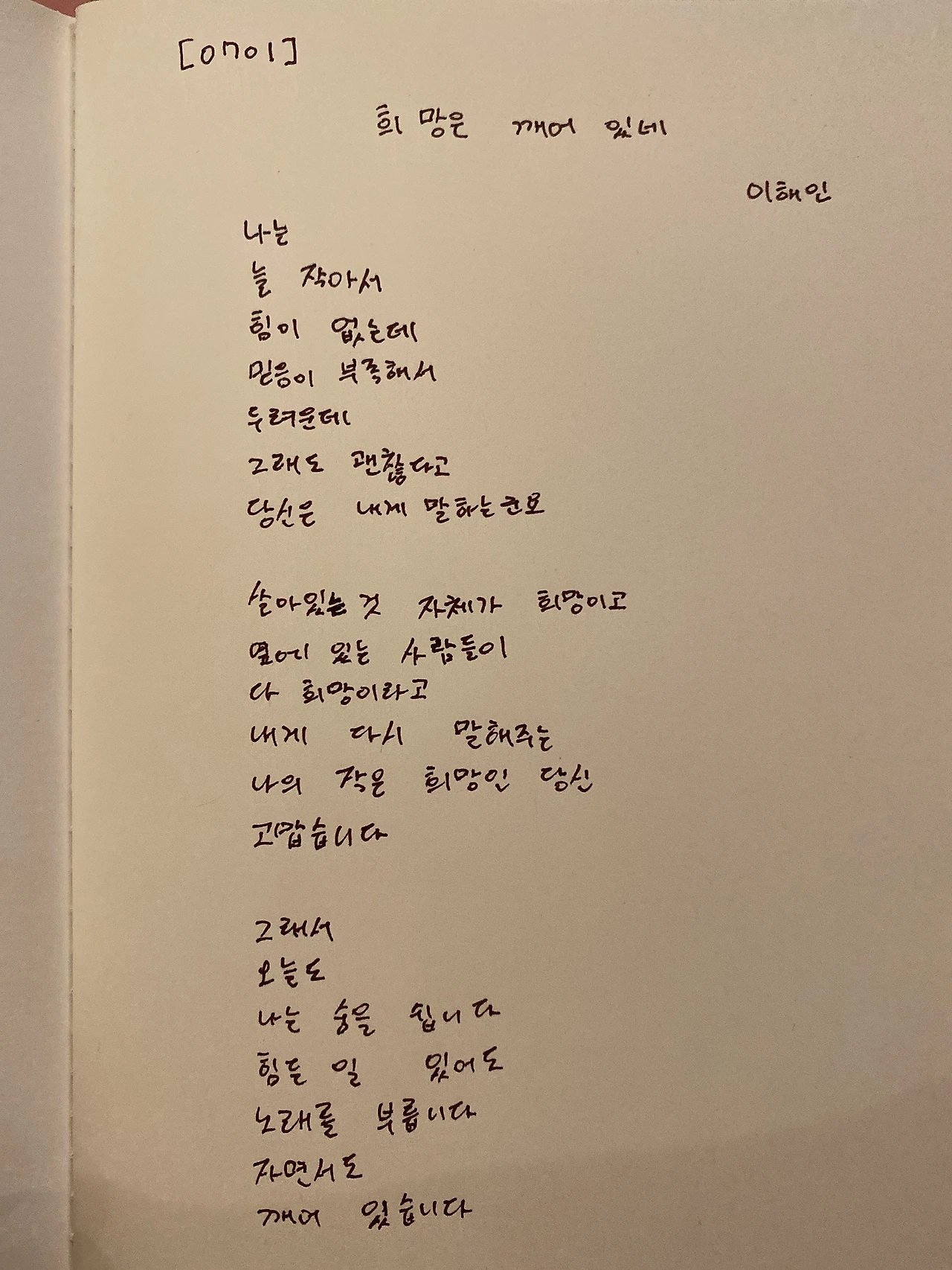 [0701] 희망은 깨어 있네 / 이해인 나는늘 작아서힘이 없는데믿음이 부족해서두려운데그래도 괜찮다고당신은 내게 말하는군요 살아 있는 것 자체가 희망이고옆이 있는 사람들이다 희망이라고내게 다시 말해주는나의 작은 희망인 당신고맙습니다 그래서오늘도나는 숨을 쉽니다힘든 일 있어도노래를 부릅니다자면서도깨어 있습니다