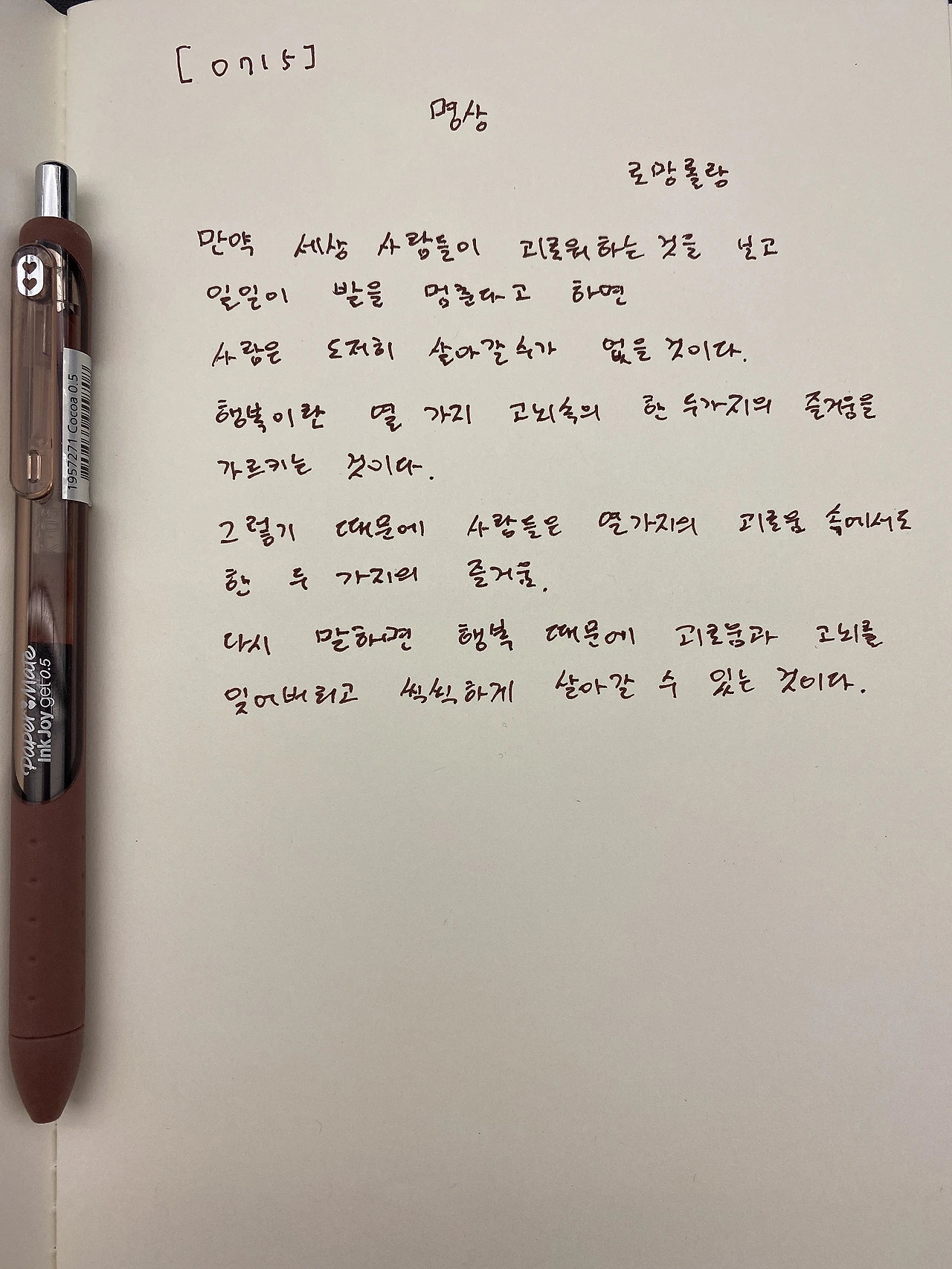 [200715] 명상 / 로망롤랑만약 세상 사람들이 괴로워하는 것을 보고 일일이 발을 멈춘다고 하면사람은 도저히 살아 갈수가 없을 것이다.행복이란 열 가지 고뇌속의 한 두 가지의 즐거움을 가리키는 것이다.그렇기 때문에 사람들은 열 가지의 괴로움 속에서도 한 두 가지의 즐거움,다시 말하면 행복 때문에 괴로움과 고뇌를 잊어버리고 씩씩하게 살아 갈 수 있는 것이다.