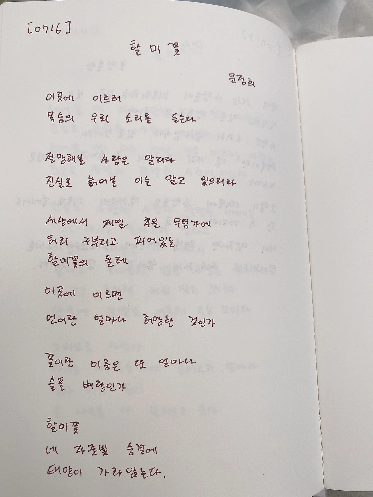 [200716] 할미꽃 / 문정희 이곳에 이르러 목숨의 우뢰 소리를 듣는다절망해본 사람은 알리라 진실로 늙어본 이는 알고 있으리라 세상에서 제일 추운 무덤가에 허리 구부리고 피어 있는 할미꽃의 둘레 이곳에 이르면 언어란 얼마나 허망한 것인가꽃이란 이름은 또 얼마나 슬픈 벼랑인가 할미꽃 네 자줏빛 숨결에 태양이 가라앉는다.