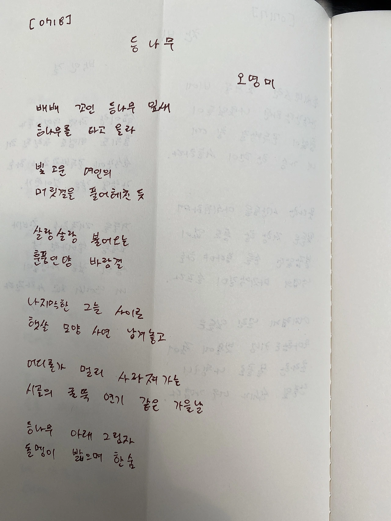 평범한 직장인. 사내 동호회를 통해 매일 한편 손으로 시 읽기를 시작한 이후로, 매일 시 한편을 필사 합니다. 필사한 시가 저작권에 문제가 된다면 말씀해주세요.