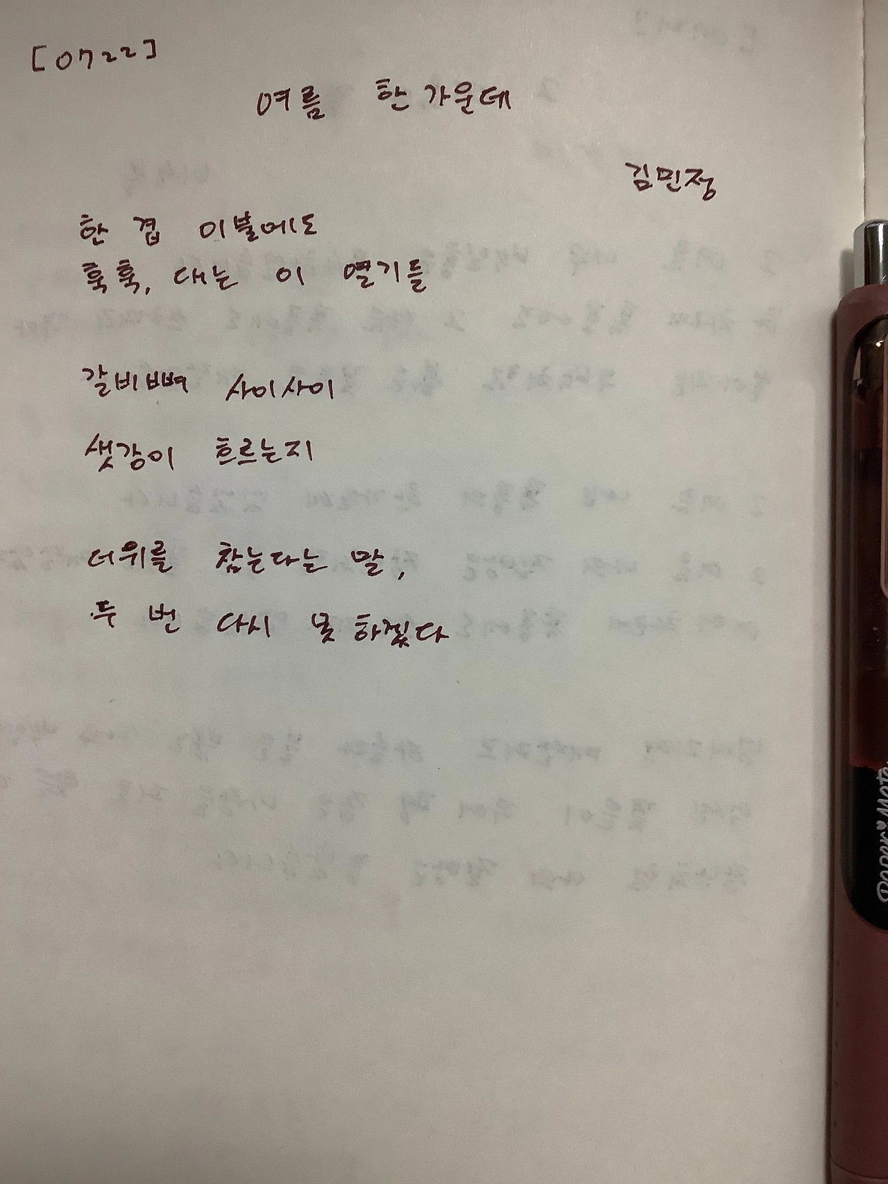 평범한 직장인. 사내 동호회를 통해 매일 한편 손으로 시 읽기를 시작한 이후로, 매일 시 한편을 필사 합니다. 필사한 시가 저작권에 문제가 된다면 말씀해주세요.