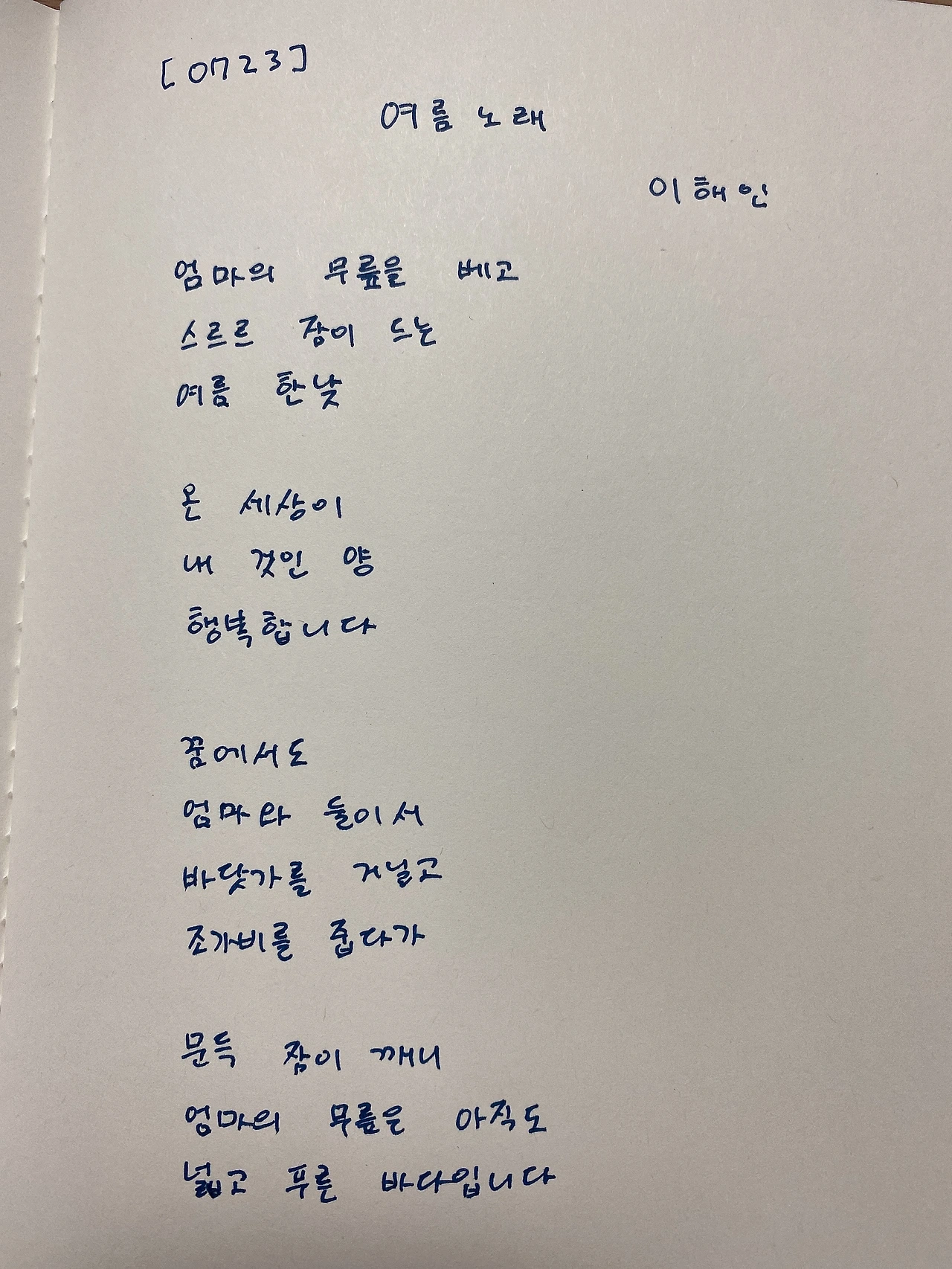 [200723] 여름 노래 / 이해인엄마의 무릎을 베고스르르 잠이 드는여름 한낮온 세상이내 것인 양행복합니다꿈에서도엄마와 둘이서바닷가를 거닐고조가비를 줍다가문득 잠이 깨니엄마의 무릎은 아직도넓고 푸른 바다입니다