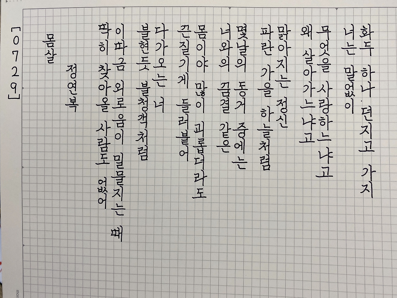 평범한 직장인. 사내 동호회를 통해 매일 한편 손으로 시 읽기를 시작한 이후로, 매일 시 한편을 필사 합니다. 필사한 시가 저작권에 문제가 된다면 말씀해주세요.