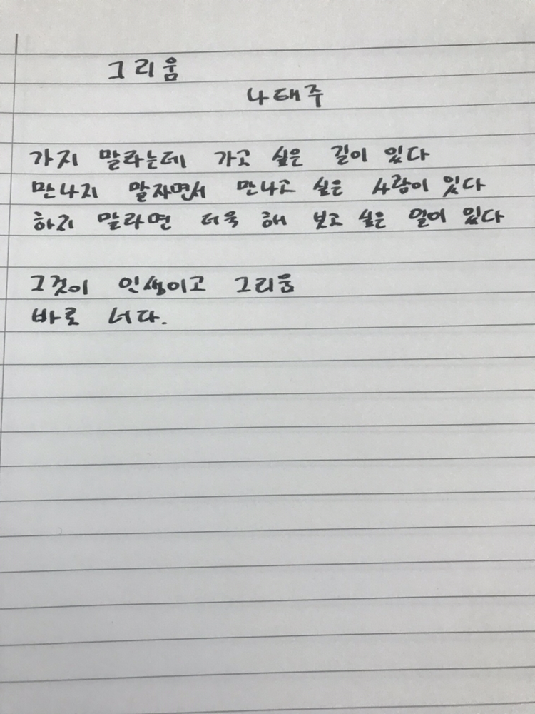 [1215] 그리움 by 나태주 가지 말라는데 가고 싶은 길이 있다만나지 말자면서 만나고 싶은 사람이 있다하지 말라면 더욱 해 보고 싶은 일이 있다그것이 인생이고 그리움바로 너다.