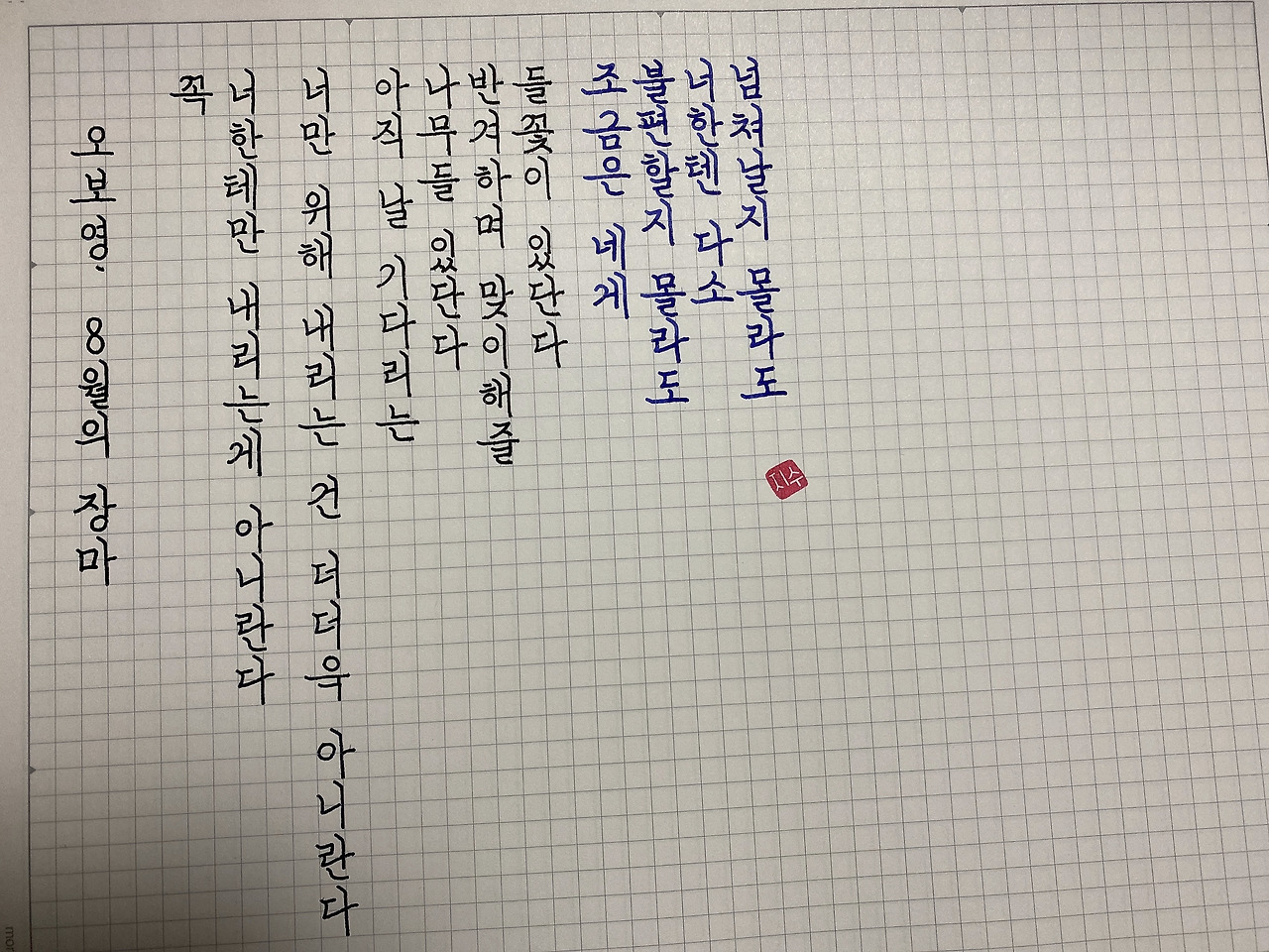 [200808] 8월의 장마 / 오보영꼭너한테만 내리는게 아니란다너만 위해 내리는 건 더더욱 아니란다아직 날 기다리는나무들 있단다반겨하며 맞이해줄들꽃이 있단다조금은 네게불편할지 몰라도너한텐 다소넘쳐날지 몰라도