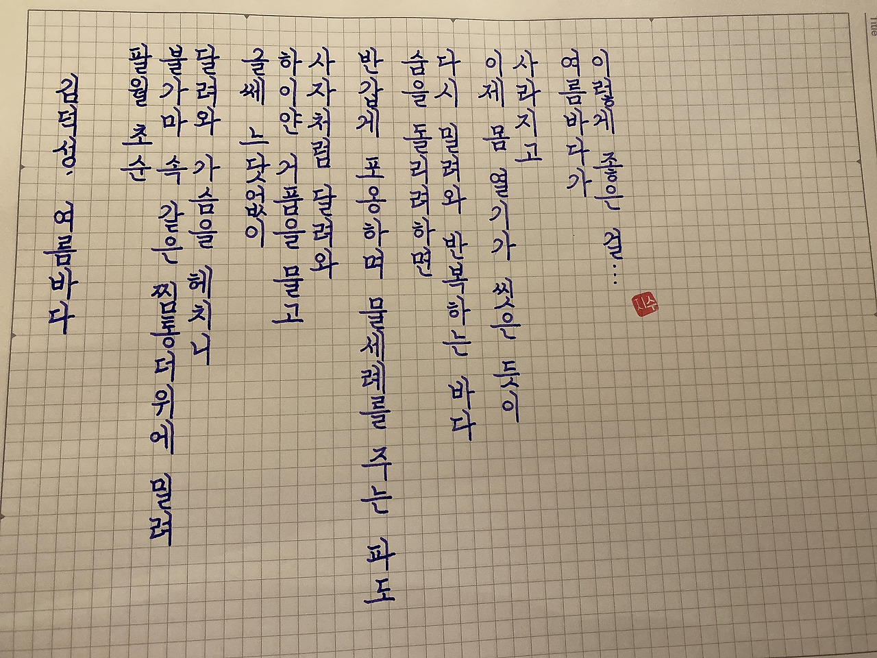 [200814] 여름바다 / 김덕성 팔월 초순 불가마 속 같은 찜통더위에 밀려 달려와 가슴을 헤치니 글쎄 느닷없이 하이얀 거품을 물고 사자처럼 달려와 반갑게 포옹하며 물세례를 주는 파도 숨을 돌리려하면 다시 밀려와 반복하는 바다 이제 몸 열기가 씻은 듯이 사라지고 여름바다가 이렇게 좋은 걸...