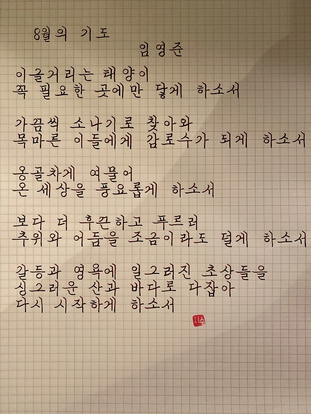 [200818] 8월의 기도 / 임영준이글거리는 태양이 꼭 필요한 곳에만 닿게 하소서 가끔씩 소나기로 찾아와 목마른 이들에게 감로수가 되게 하소서 옹골차게 여물어 온 세상을 풍요롭게 하소서 보다 더 후끈하고 푸르러 추위와 어둠을 조금이라도 덜게 하소서 갈등과 영욕에 일그러진 초상들을 싱그러운 산과 바다로 다잡아 다시 시작하게 하소서