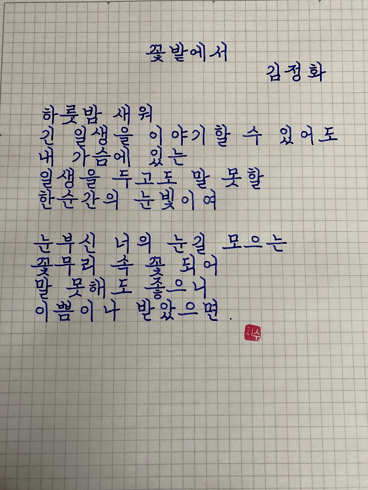 평범한 직장인. 사내 동호회를 통해 매일 한편 손으로 시 읽기를 시작한 이후로, 매일 시 한편을 필사 합니다. 필사한 시가 저작권에 문제가 된다면 말씀해주세요.