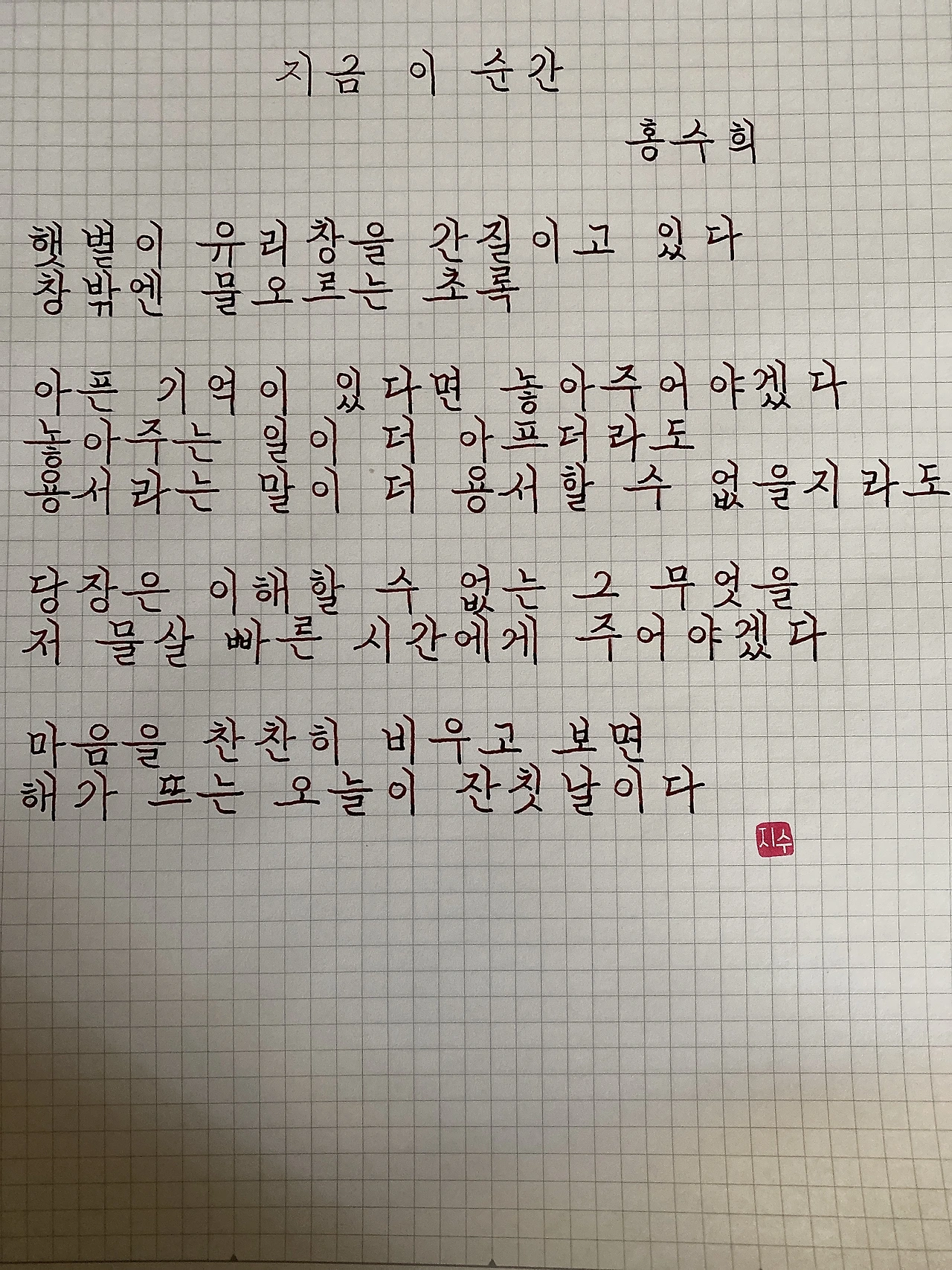 평범한 직장인. 사내 동호회를 통해 매일 한편 손으로 시 읽기를 시작한 이후로, 매일 시 한편을 필사 합니다. 필사한 시가 저작권에 문제가 된다면 말씀해주세요.