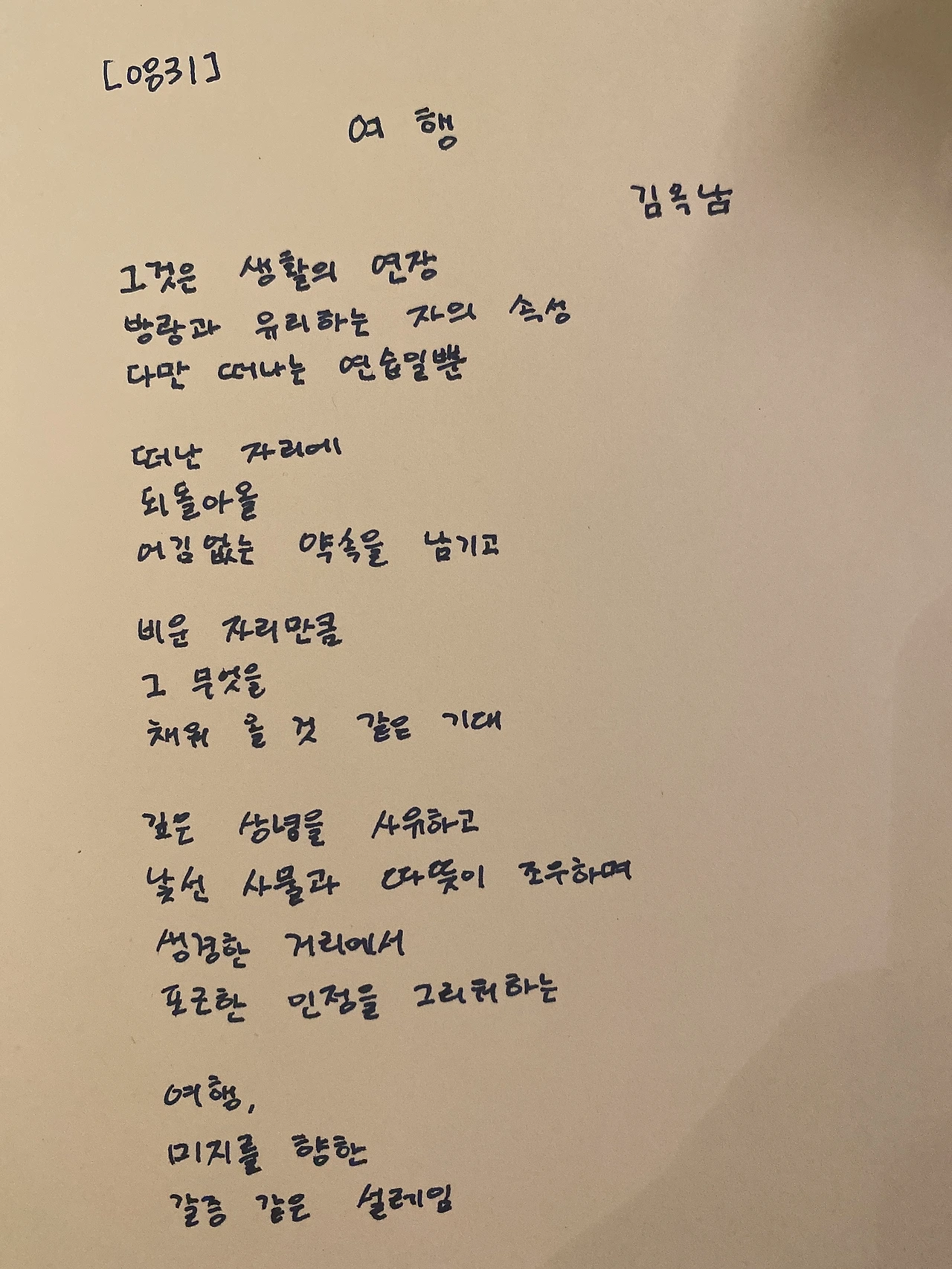 [200831] 여행 / 김옥남 그것은 생활의 연장 방랑과 유리하는 자의 속성 다만 떠나는 연습일 뿐 떠난 자리에 되돌아올 어김없는 약속을 남기고 비운 자리만큼 그 무엇을 채워 올 것 같은 기대 깊은 상념을 사유하고 낯선 사물과 따뜻이 조우하며 생경한 거리에서 포근한 인정을 그리워하는 여행, 미지를 향한 갈증 같은 설레임