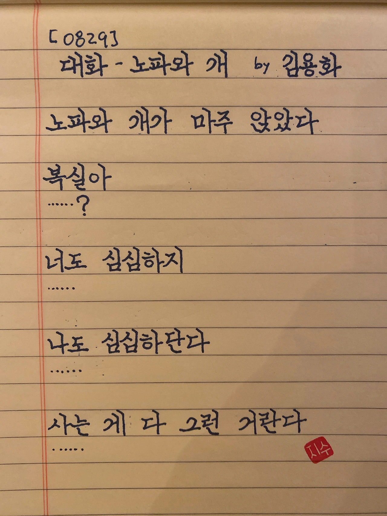 [200829] 대화-노파와 개 / 김용화노파와 개가 마주 앉았다 복실아 ……? 너도 심심하지 …… 나도 심심하단다 …… 사는 게 다 그런 거란다 ……