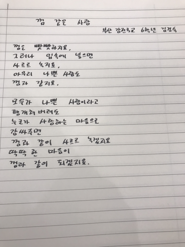 [1217] 껌 같은 사람 by 부산 감전국교 6학년 김경숙껌은 빳빳하지요,그러나 입속에 넣으면사르르 녹지요,아무리 나쁜 사람도껌과 같지요,모두가 나쁜 사람이라고팽개쳐버려도누군가 사랑하는 마음으로감싸 주면껌과 같이 사르르 녹겠지요딱딱한 마음이껌과 같이 되겠지요.