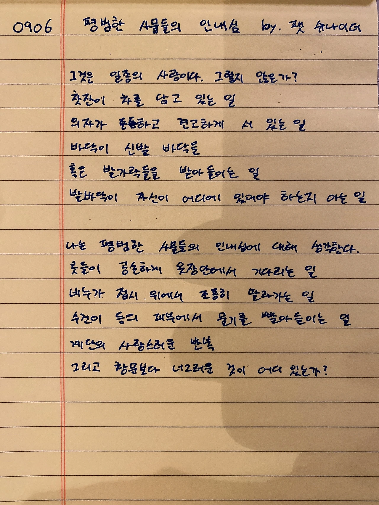 나는 평범한 사물들의 인내심에 대해 생각한다.