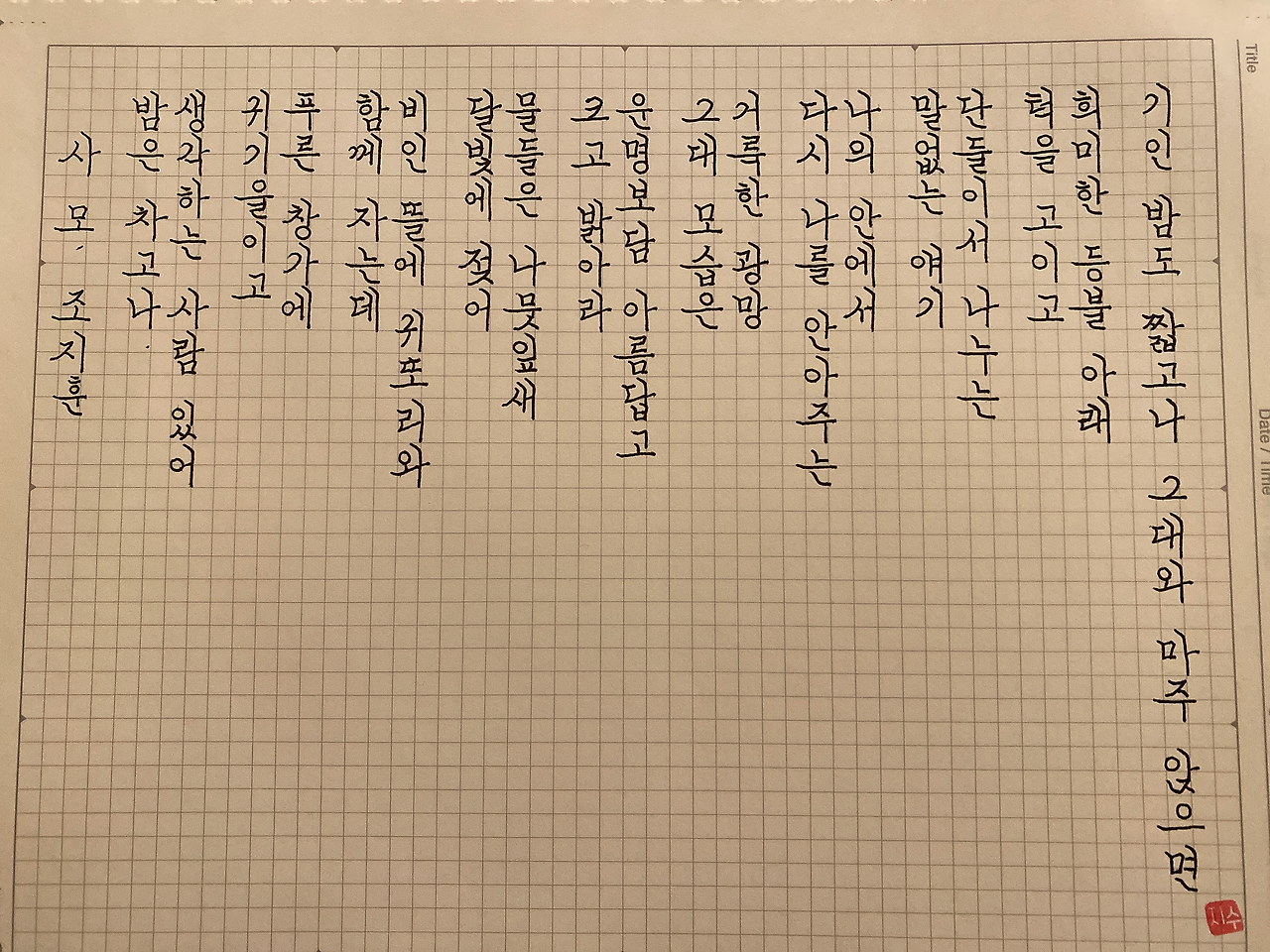 평범한 직장인. 사내 동호회를 통해 매일 한편 손으로 시 읽기를 시작한 이후로, 매일 시 한편을 필사 합니다. 필사한 시가 저작권에 문제가 된다면 말씀해주세요.