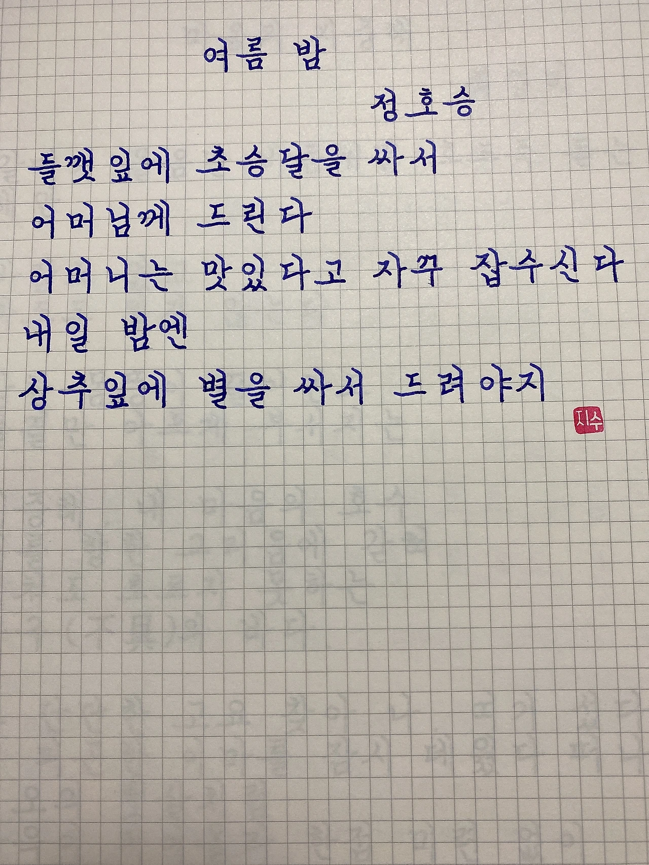 여름 밤/ 정호승들깻잎에 초승달을 싸서어미님께 드린다어머니는 맛있다고 자꾸 잡수신다내일 밤엔상추잎에 별을 싸서 드려야지