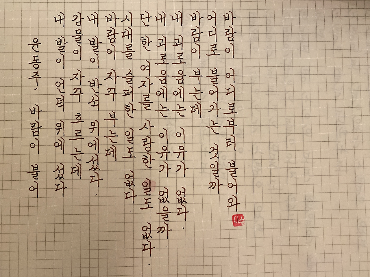 평범한 직장인. 사내 동호회를 통해 매일 한편 손으로 시 읽기를 시작한 이후로, 매일 시 한편을 필사 합니다. 필사한 시가 저작권에 문제가 된다면 말씀해주세요.