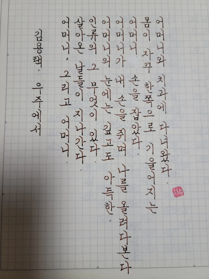 우주에서 by 김용택어머니와 치과에 다녀왔다.몸이 자꾸 한쪽으로 기울어지는어머니 손을 잡았다.어머니가 내 손을 쥐며 나를 올려다본다.어머니의 눈에는 깊고도 아득한,인류의 그 무엇이 있다.살아온 날들이 지나간다.어머니, 그리고 어머니.
