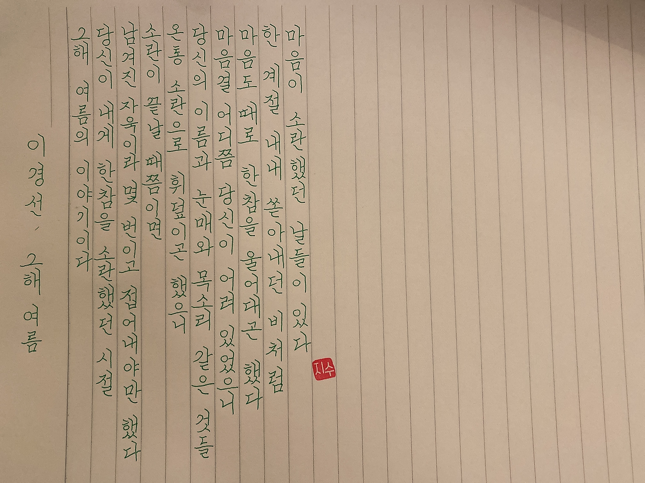 평범한 직장인. 사내 동호회를 통해 매일 한편 손으로 시 읽기를 시작한 이후로, 매일 시 한편을 필사 합니다. 필사한 시가 저작권에 문제가 된다면 말씀해주세요.