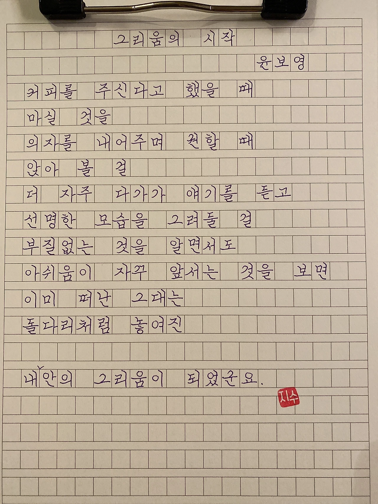 평범한 직장인. 사내 동호회를 통해 매일 한편 손으로 시 읽기를 시작한 이후로, 매일 시 한편을 필사 합니다. 필사한 시가 저작권에 문제가 된다면 말씀해주세요.