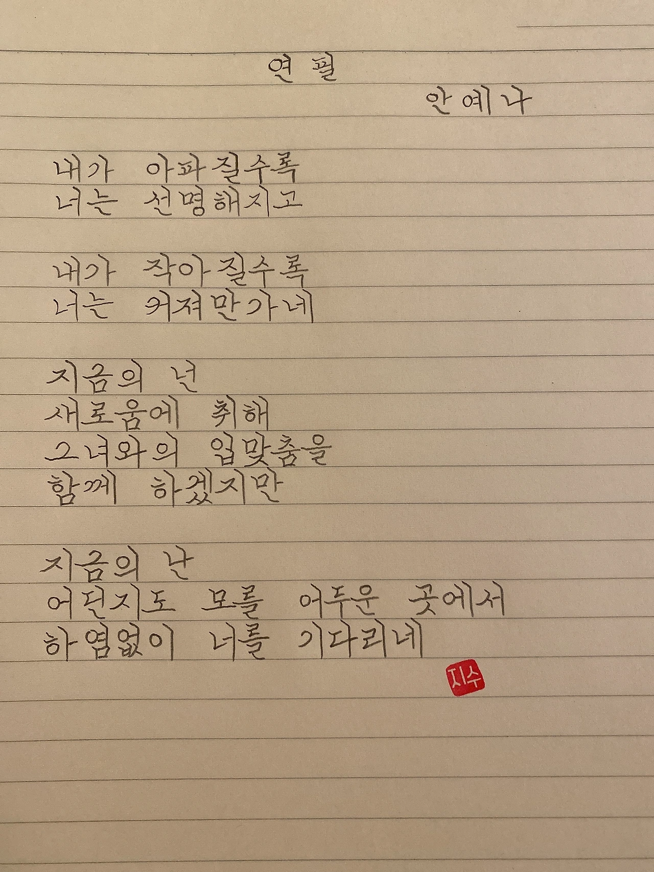 평범한 직장인. 사내 동호회를 통해 매일 한편 손으로 시 읽기를 시작한 이후로, 매일 시 한편을 필사 합니다. 필사한 시가 저작권에 문제가 된다면 말씀해주세요.