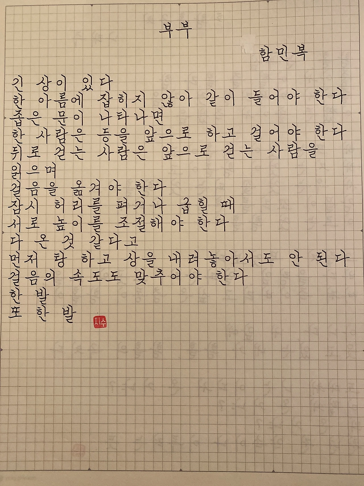 부부 by 함민복긴 상이 있다한 아름에 잡히지 않아 같이 들어야 한다좁은 문이 나타나면한 사람은 등을 앞으로 하고 걸어야 한다뒤로 걷는 사람은 앞으로 걷는 사람을 읽으며걸음을 옮겨야 한다잠시 허리를 펴거나 굽힐 때서로 높이를 조절해야 한다다 온 것 같다고먼저 탕 하고 상을 내려놓아서도 안 된다걸음의 속도도 맞추어야 한다한 발또 한 발