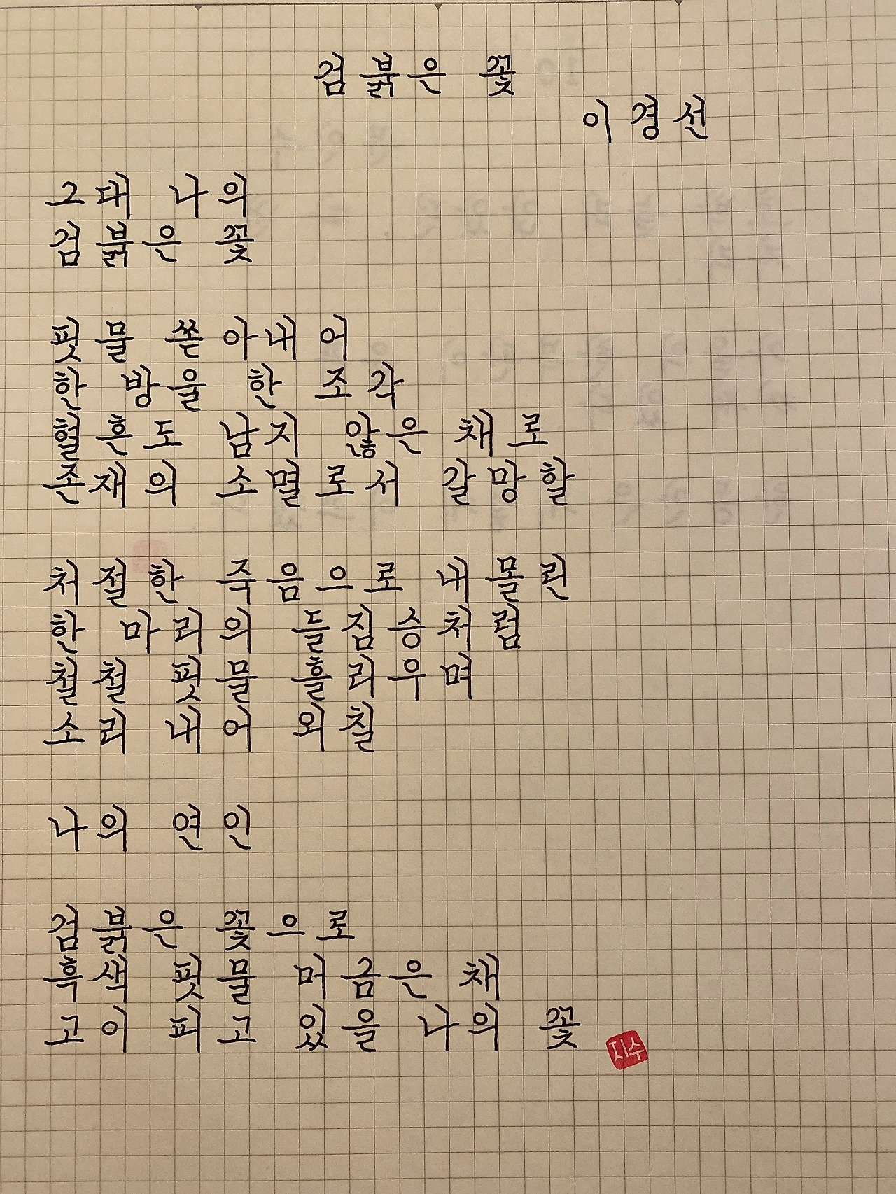 평범한 직장인. 사내 동호회를 통해 매일 한편 손으로 시 읽기를 시작한 이후로, 매일 시 한편을 필사 합니다. 필사한 시가 저작권에 문제가 된다면 말씀해주세요.