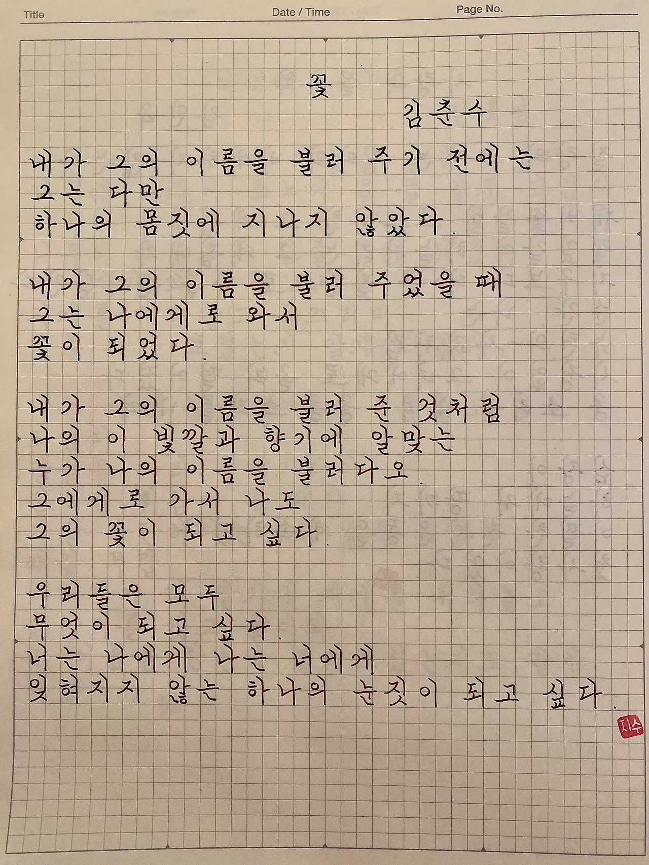 평범한 직장인. 사내 동호회를 통해 매일 한편 손으로 시 읽기를 시작한 이후로, 매일 시 한편을 필사 합니다. 필사한 시가 저작권에 문제가 된다면 말씀해주세요.