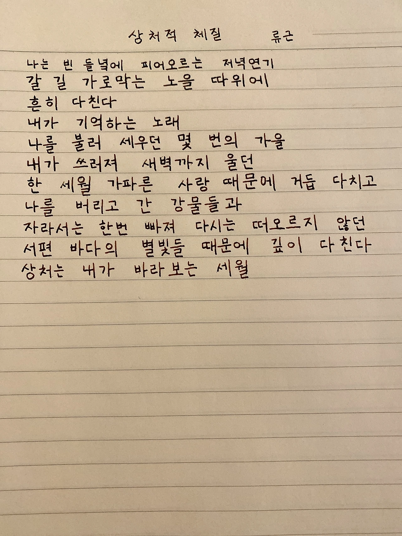 평범한 직장인. 사내 동호회를 통해 매일 한편 손으로 시 읽기를 시작한 이후로, 매일 시 한편을 필사 합니다. 필사한 시가 저작권에 문제가 된다면 말씀해주세요.