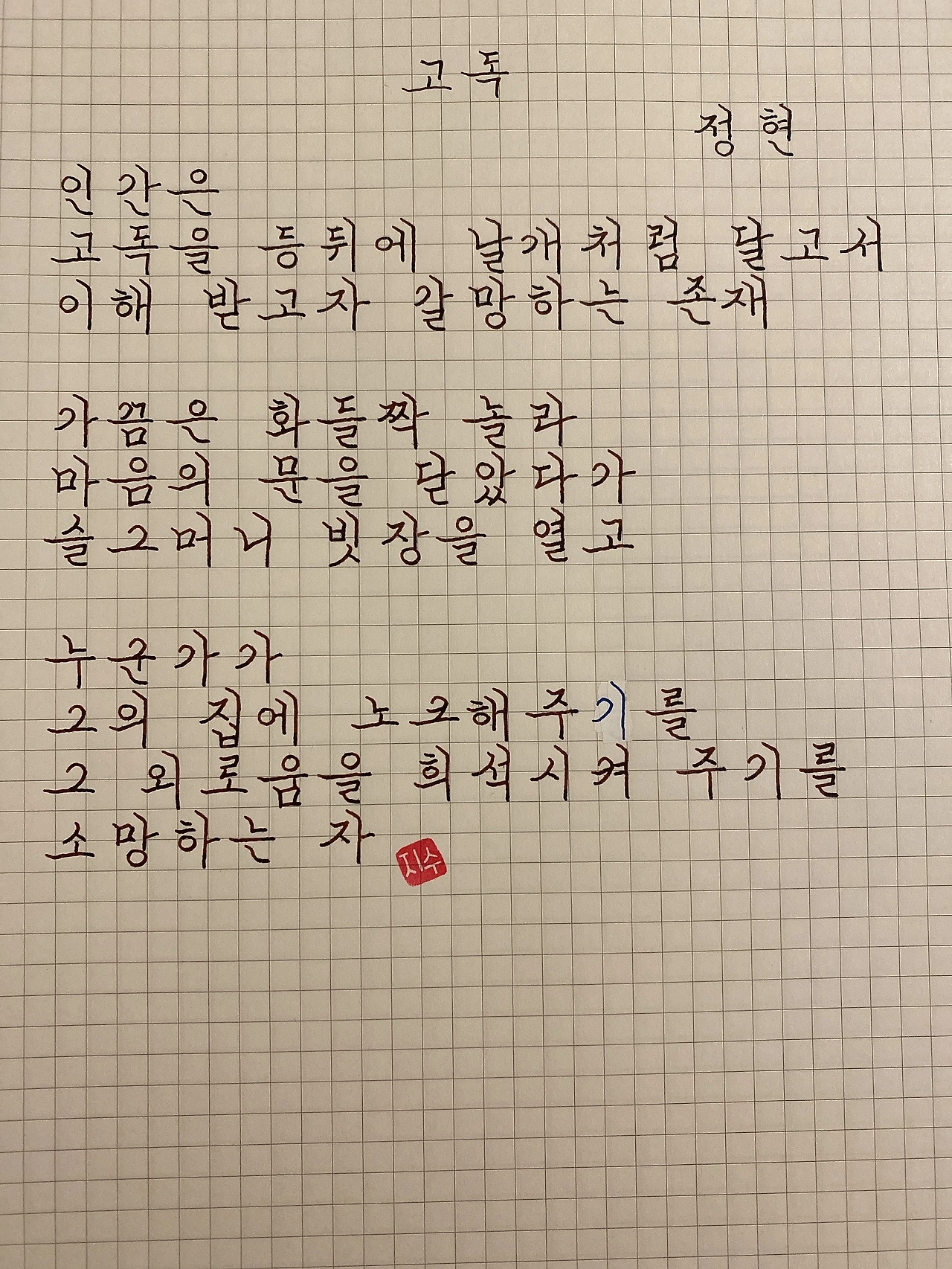 평범한 직장인. 사내 동호회를 통해 매일 한편 손으로 시 읽기를 시작한 이후로, 매일 시 한편을 필사 합니다. 필사한 시가 저작권에 문제가 된다면 말씀해주세요.
