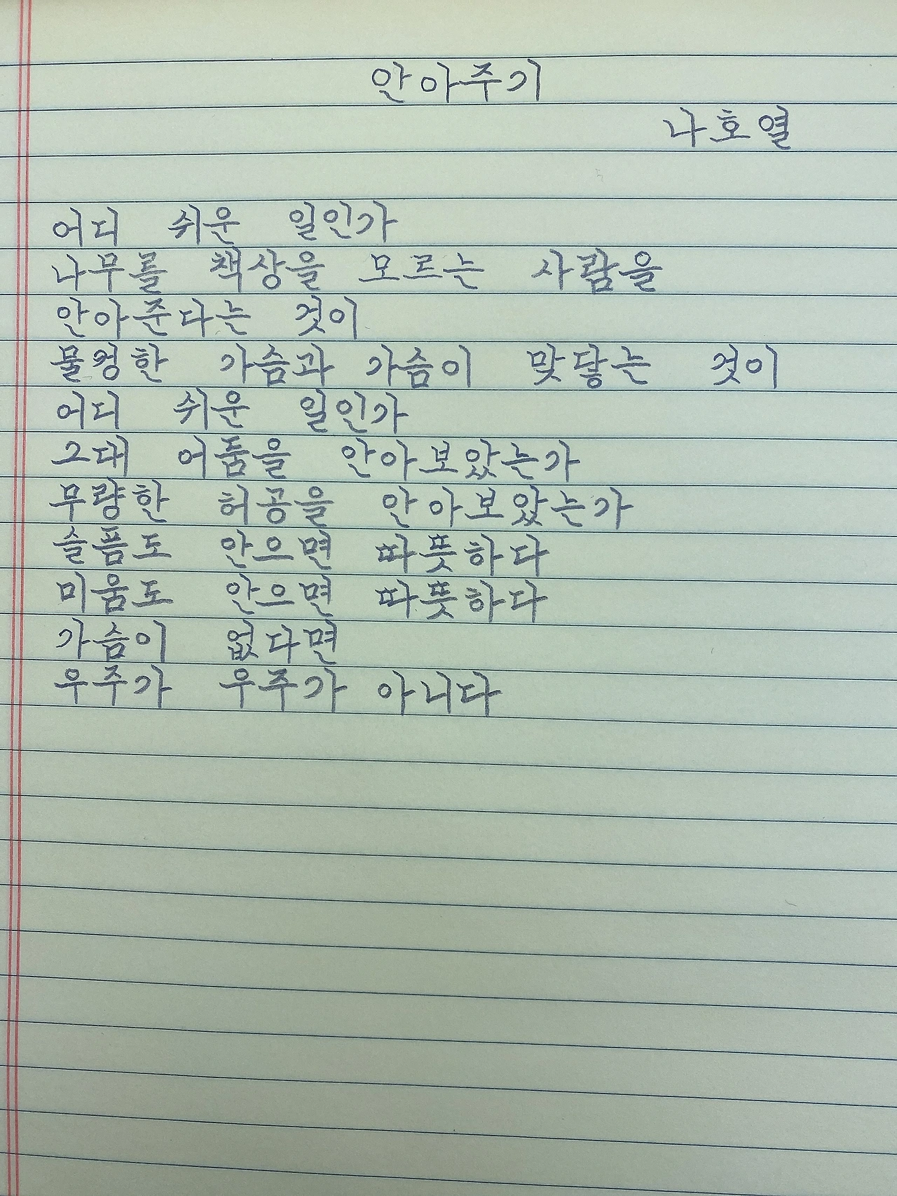 안아주기 - 나호열어디 쉬운 일인가나무를 책상을 모르는 사람을안아준다는 것이물컹한 가슴과 가슴이 맞닿는 것이어디 쉬운 일인가그대 어둠을 안아보았는가무량한 허공을 안아보았는가슬픔도 안으면 따뜻하다미움도 안으면 따뜻하다가슴이 없다면우주가 우주가 아니다