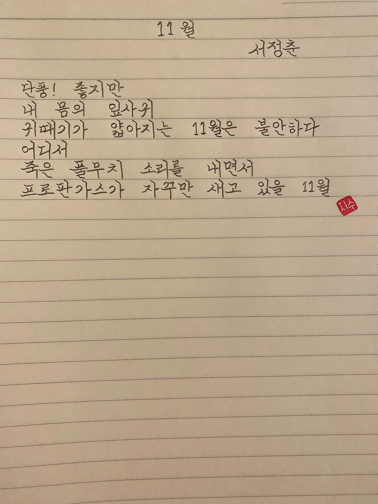 11월 /서정춘단풍! 좋지만내 몸의 잎사귀귀때기가 얇아지는 11월은 불안하다어디서죽은 풀무치 소리를 내면서프로판가스가 자꾸만 새고 있을 11월