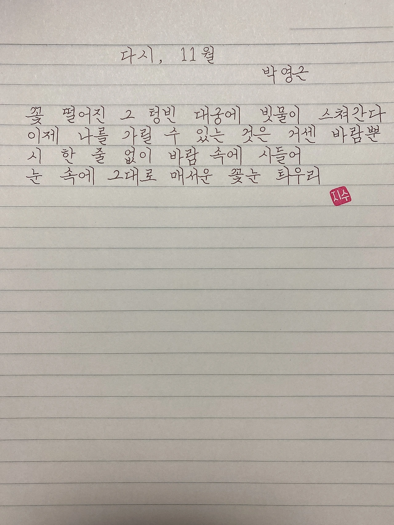 평범한 직장인. 사내 동호회를 통해 매일 한편 손으로 시 읽기를 시작한 이후로, 매일 시 한편을 필사 합니다. 필사한 시가 저작권에 문제가 된다면 말씀해주세요.